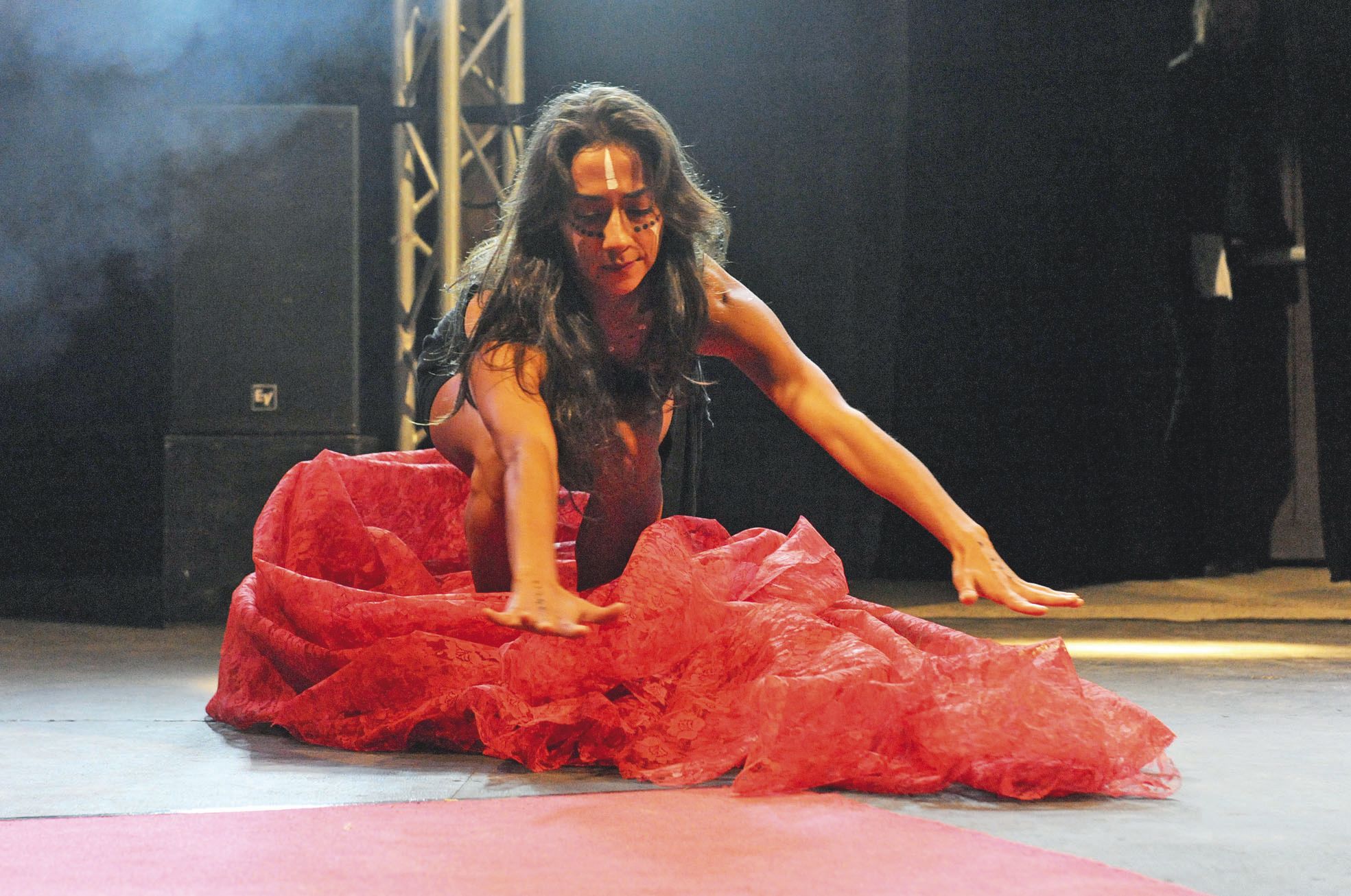 Si l’histoire du Chili est douloureuse, il faut savoir prendre de la distance. Et s’élever pour avancer. Ainsi la danseuse Flavie, drapée d’un tissu rouge vif, est apparue perchée en haut d’un escalier. Puis elle en est descendue et s’est lancée dans une danse, mêlant gestes traditionnels et pratique contemporaine. Avec ce symbole fort, elle a fait le choix de se tourner vers l’avenir.