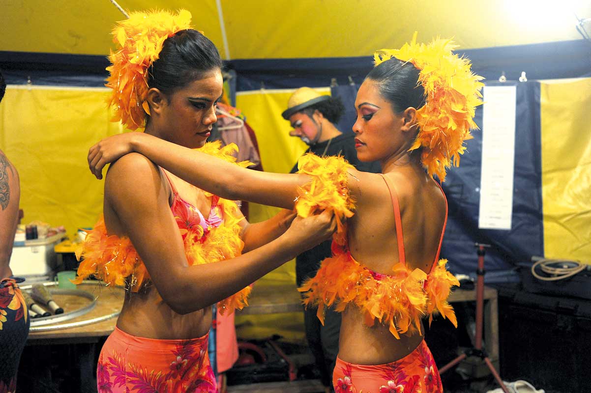 Le Magic Circus, côté artistes ; le 07/22/2011 - 22:19Si les artistes sont concentrés, la bonne humeur constatée sur scène les accompagne également dans les coulisses.Photo : Mathurin Derel