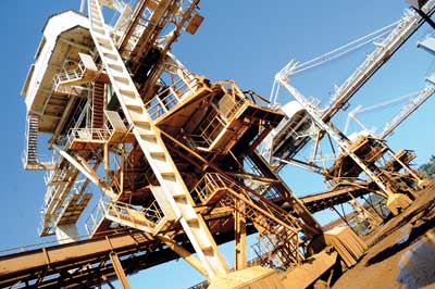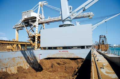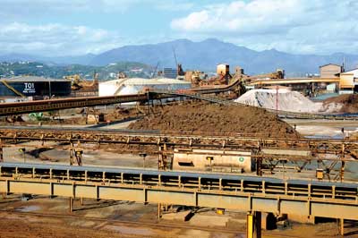 Les grutiers déposent le minerai directement sur le convoyeur, un tapis roulant, qui le conduit à l'usine de Doniambo.