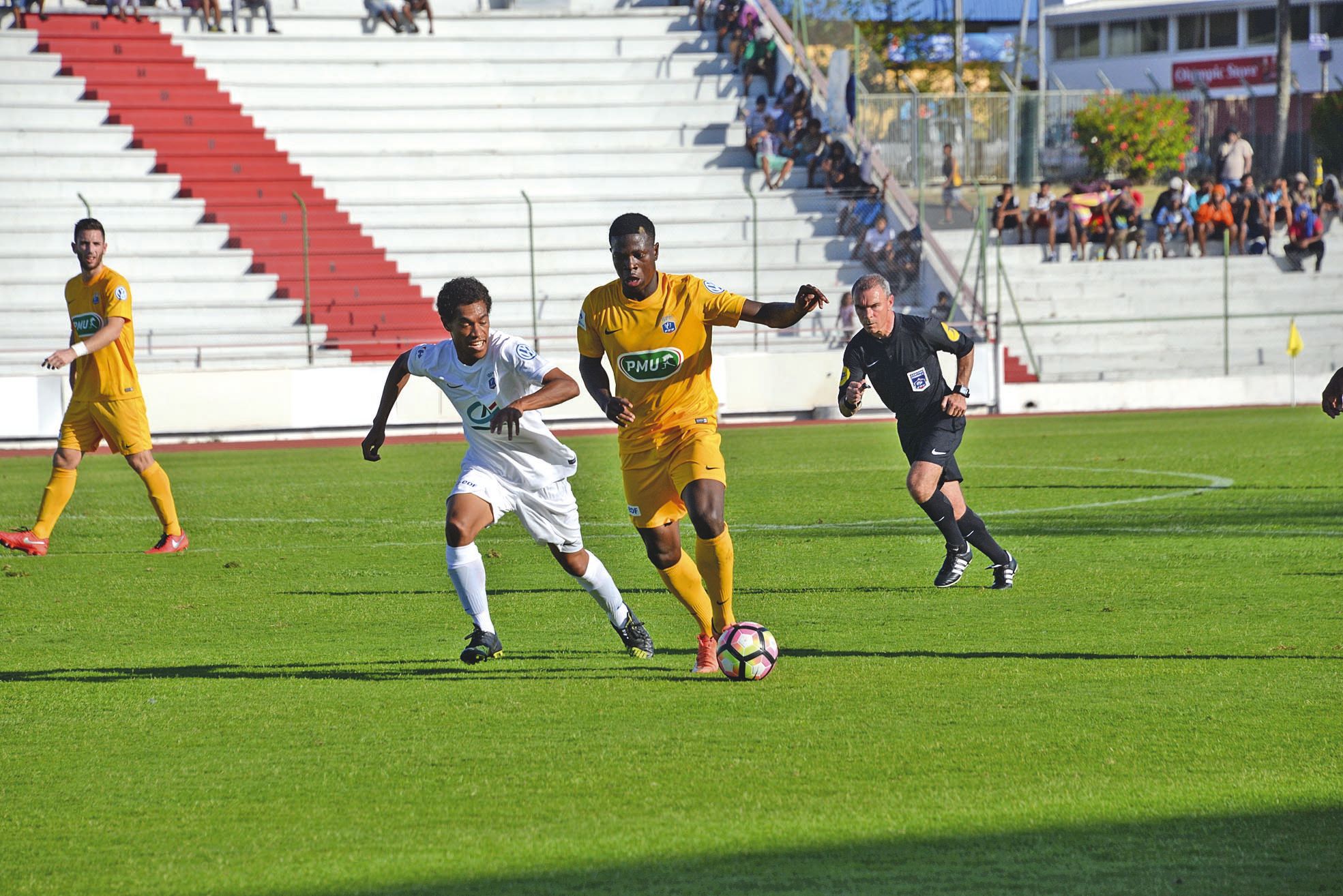 5 > Star. Le Camerounais Kévin Soni (maillot jaune), 18 ans, prêté par Bordeaux et positionné samedi en ailier gauche côte Pau, a fait des misères à son vis-à-vis, Grégory Taramoin, comme à l’ensemble de la défense de Magenta. C’est lui qui ouvre le score d’une frappe croisée de 25 mètres, pleine lucarne. On le voit ici en possession du ballon, avec son pied gauche, sous le regard de l’arbitre du match, Lionel Jaffredo, 46 ans, habitué des terrains de Ligue 1 et de Ligue 2.