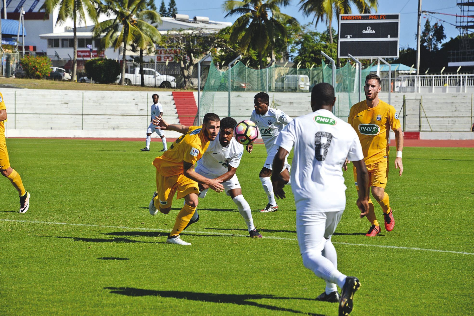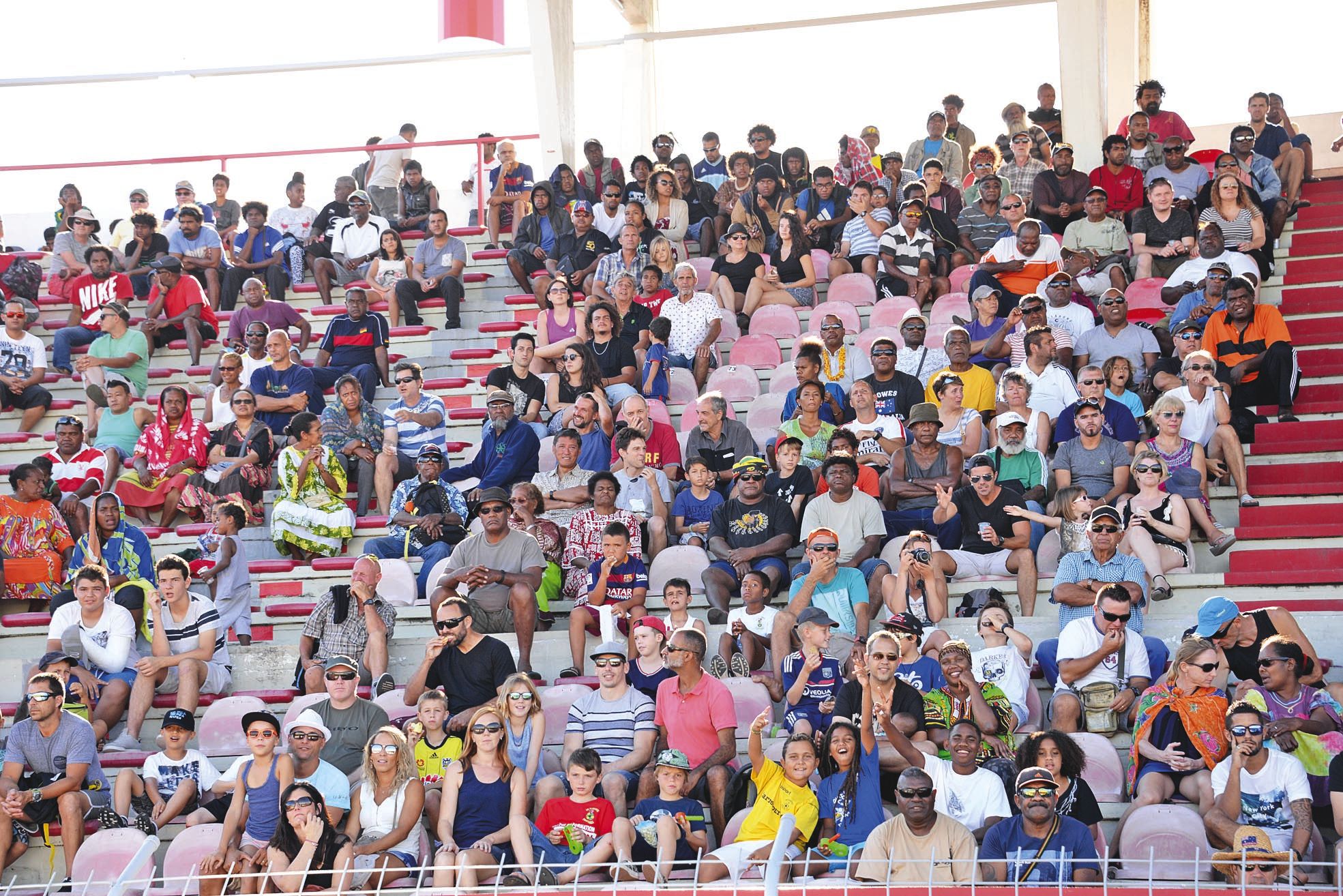 4 > Public. Malgré le fait que la rencontre était retransmise en direct à la télévision, le public calédonien s’est déplacé assez nombreux pour voir Magenta se frotter aux joueurs professionnels palois. Environ 3 000 personnes ont ainsi garni les tribunes du stade Numa-Daly, essentiellement celle à l’ombre, protégée du soleil par un toit. Dans la ligne droite opposée, ils étaient une centaine assis en pleine chaleur.