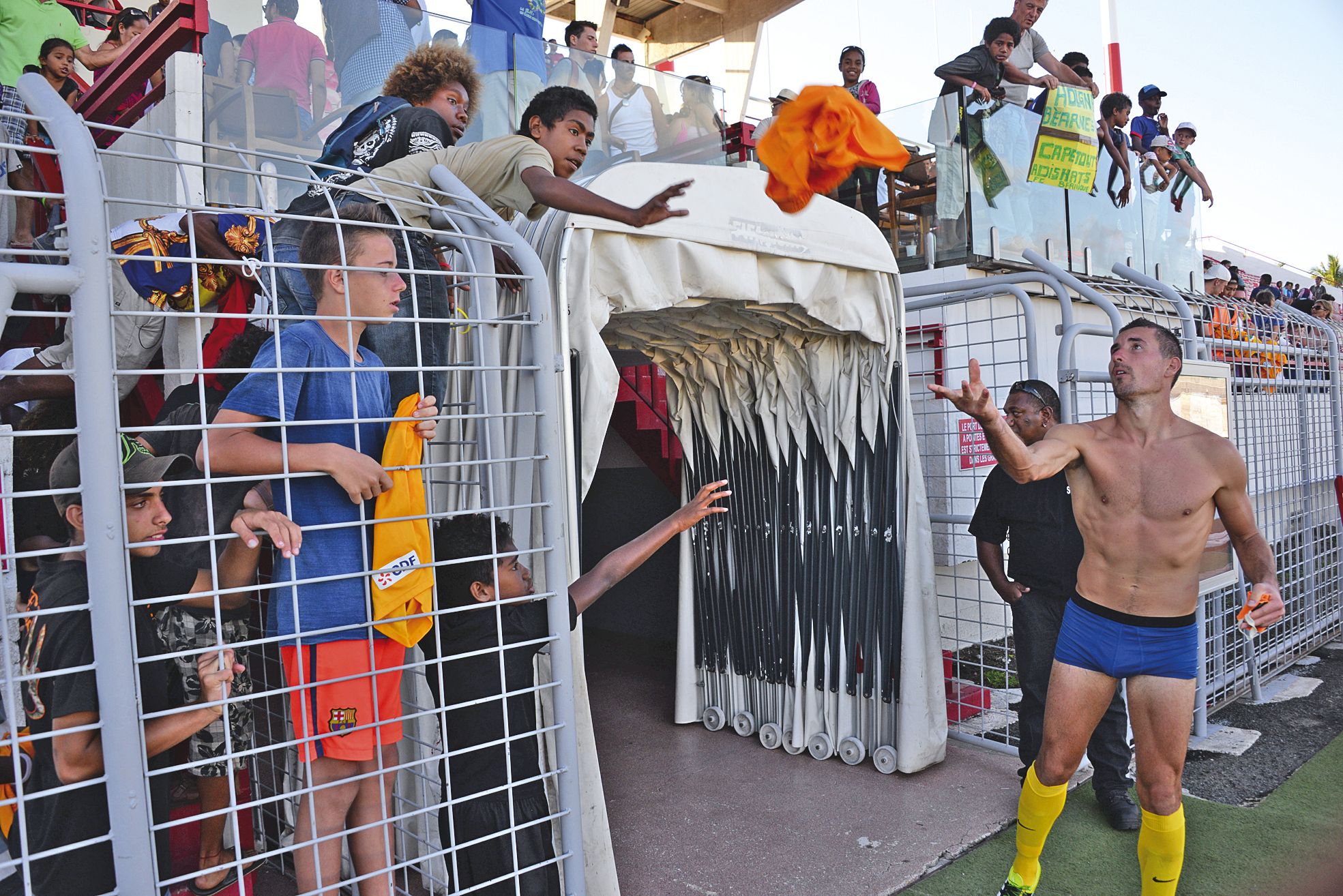 3 > Générosité. Comme certains de ses coéquipiers, le défenseur central et capitaine du Pau FC, Yoan Oswald (à droite), a offert son short et son maillot à des jeunes spectateurs, forcément heureux.
