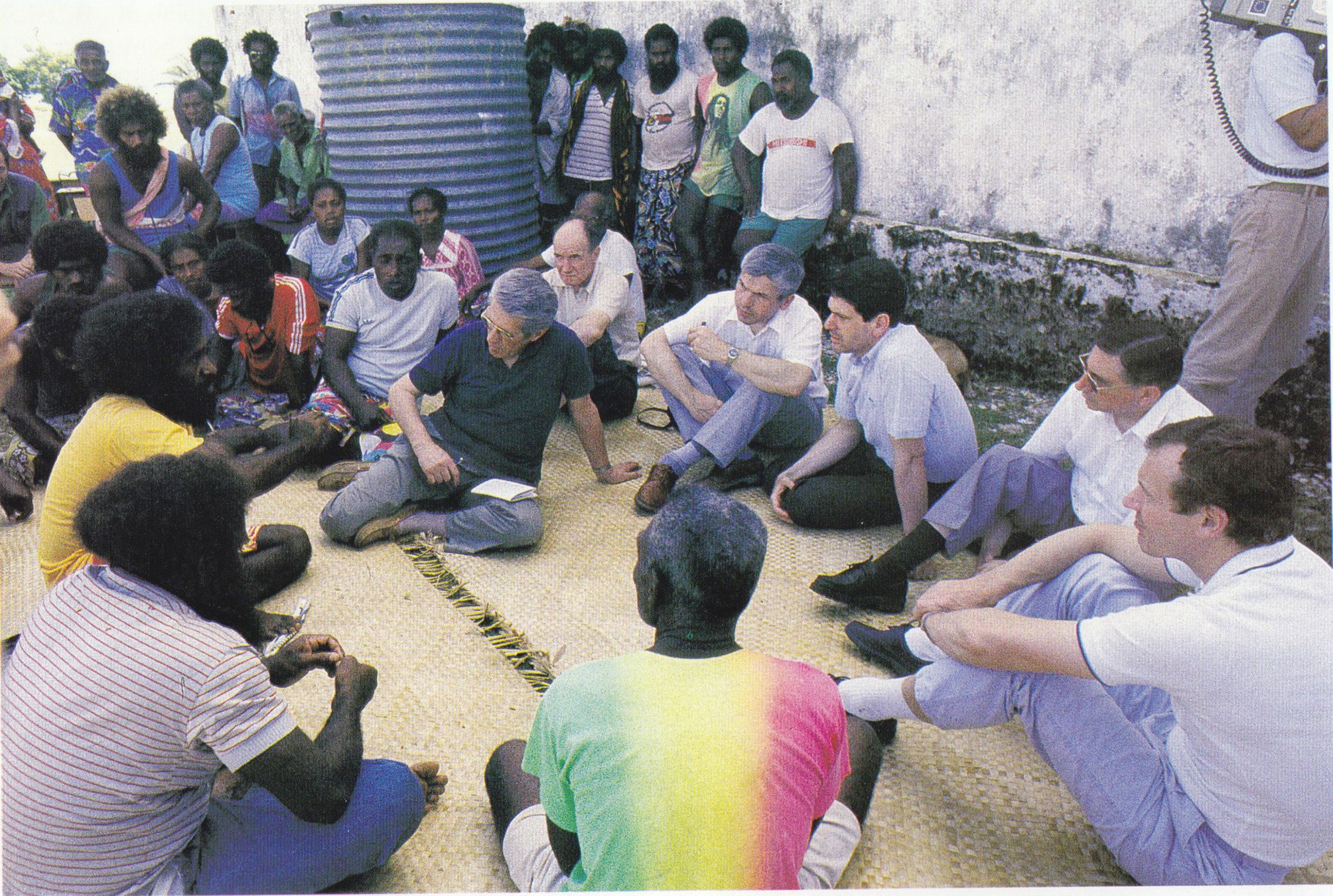 La mission du dialogue : en haut, de gauche à droite, Roger Leray, Pierre Steinmetz, Jean-Claude Perrier, Christian Blanc, Jacques Stewart, et Paul Guiberteau. En bas, échanges à Ouvéa. Photos Mémorial Calédonien et Thierry Perron