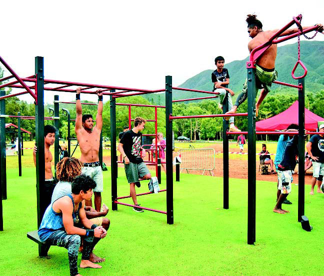 La structure de street workout de La Coulée est la plus grande du Mont-Dore. Ethan, en haut à droite, vient chaque jour s’entraîner.