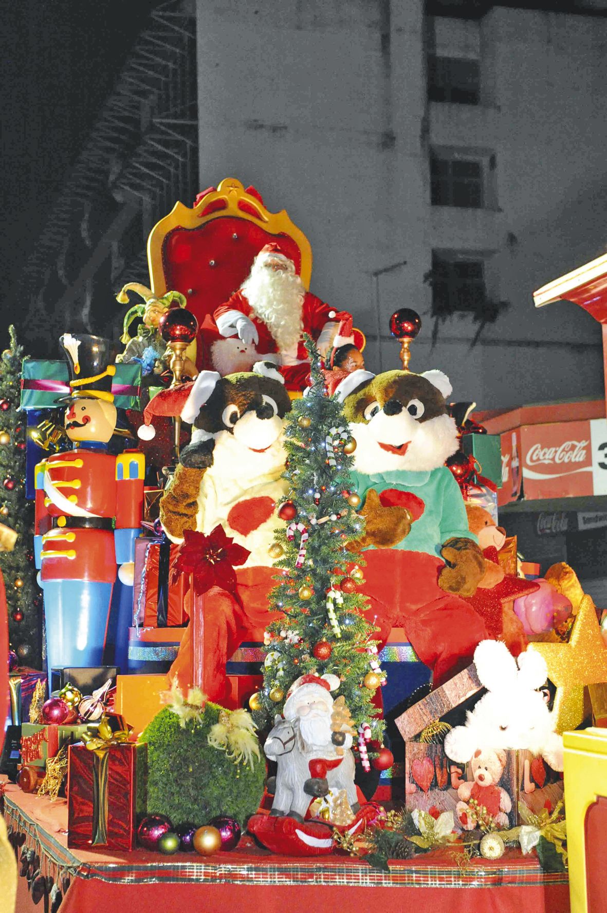 Le père Noël a pris place sur son somptueux traîneau tiré par une locomotive. Il était assis dans un magnifique fauteuil rouge, encadré par de nombreux paquets cadeaux, un sapin de Noël, un lutin, ainsi que des peluches géantes de Tic et Tac.