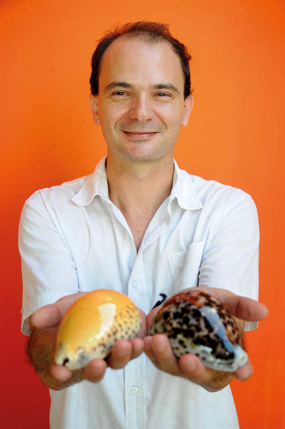 William Alighieri tient dans sa main gauche la plus belle porcelaine calédonienne Tigris jaune, connue dans le monde, et dans sa main droite une porcelaine Tigris classique.