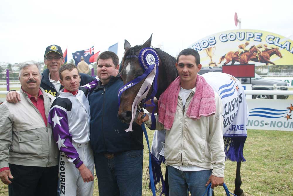 cheval2 ; le 08/07/2011 - 20:40La photo de famille de Karigoa du Verger après sa victoire dans la Casinos Coupe Clarke avec Alain Robelin (naisseur), Pascal Szymanski (propriétaire), Jonathan Bouriez (jockey) et Didier Lods (entraîneur de l'écurie River Horse).