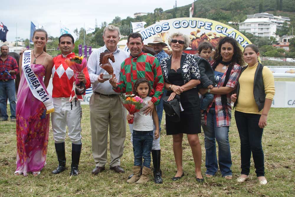cheval ; le 08/07/2011 - 20:39Remise du trophée du Prix Les Nouvelles calédoniennes par son directeur Philippe Demazel (au centre), aux deux jockeys Gentlemen Riders exæquo, Patrick Greppo et David Debels.