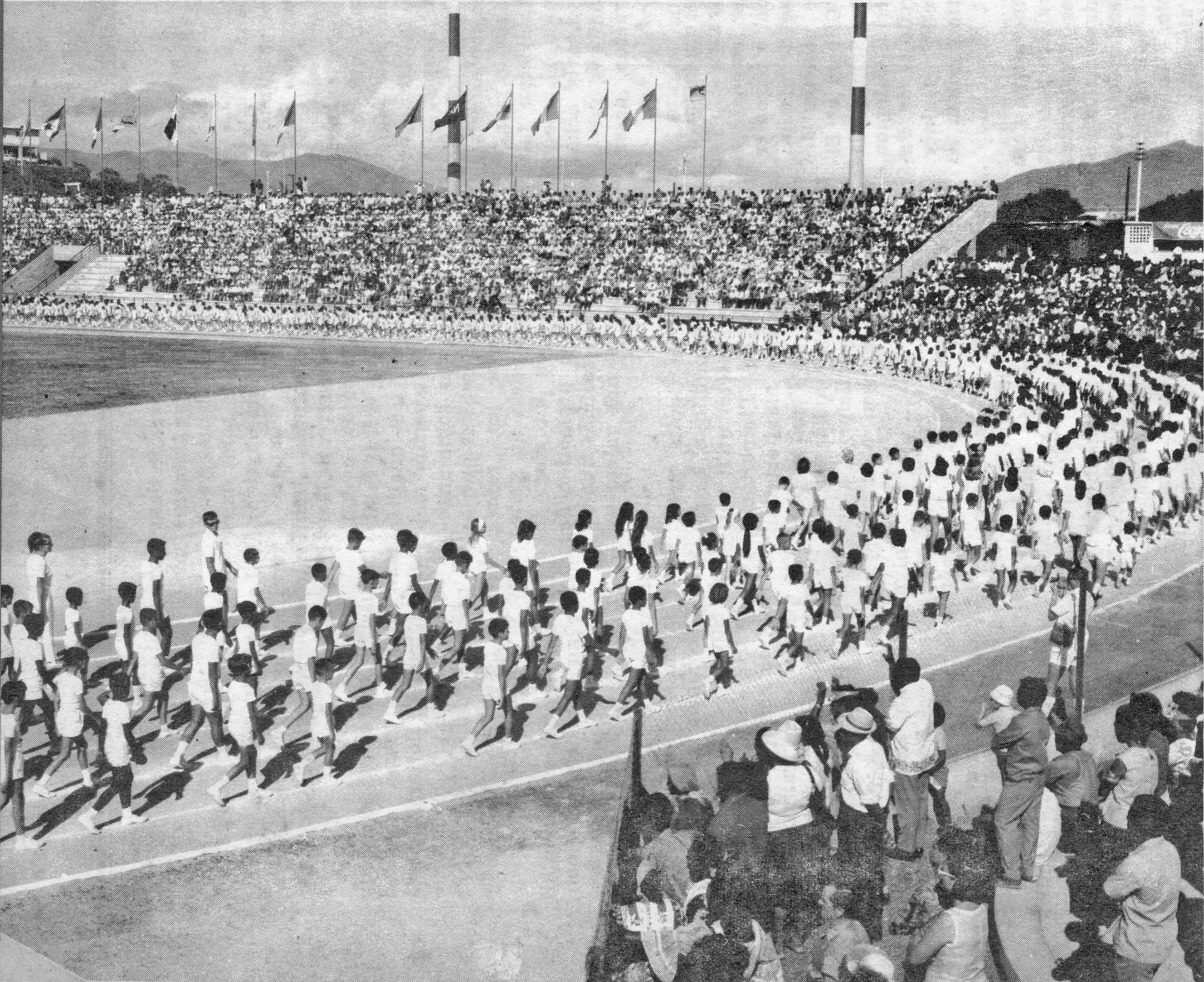 1 > 8 décembre 1966. Le stade est inauguré lors de la cérémonie d’ouverture des IIes Jeux du Pacifique où près de 1 500 élèves des écoles publiques et privées calédoniennes (en blanc sur la photo) ont défilé après les 14 délégations océaniennes.