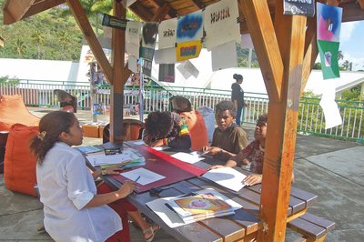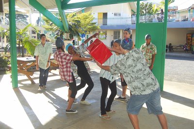 Les travaux effectués dans le cadre de la scolarité des lycéens étaient présentés un peu partout dans le lycée. Ici, un atelier de création de graffs avec pochoirs, destinés à un projet de décoration du CDI. A noter aussi un championnat de mémoire, avec apprentissage de trois techniques de base, organisé par la Mascop (Mission d’accompagnement de la scolarité en province Nord), ou le jeu de l’oie géant de l’association Pöpwadene (Comité de gestion de Poindimié de conservation du lagon).