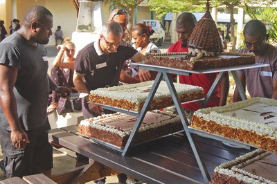 Le gâteau, en cinq parties, et surmonté d’une case tuilée en chocolat, était splendide. Il avait été préparé par l’équipe de cuisine.