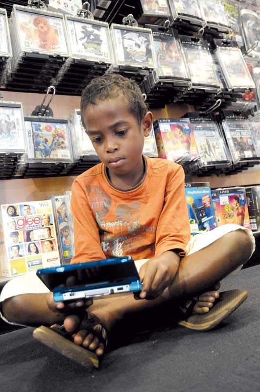 Les Calédoniens, dingues de nouvelles technologies ? ; le 07/06/2011 - 17:31Edouard, 7 ans, a reçu en cadeau une Nintendo DS il y a dix mois. Mais, déjà, son regard se tourne vers la Nintendo 3D, qu'il essaie sur cette photo. La console se vend 39 900 francs.Photo Delphine Mayeur