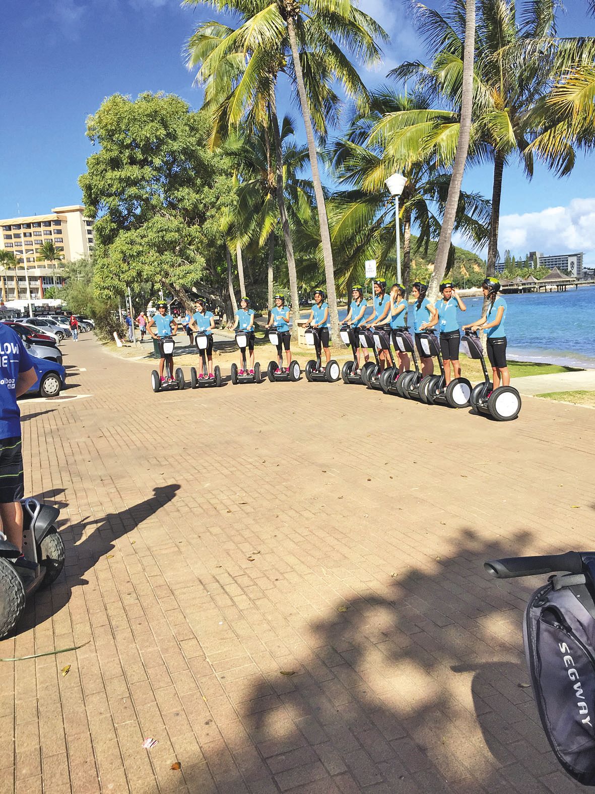 Va’a et stand-up paddle : pour rester dans l’esprit du thème autour de la « féerie marine », toutes les activités des candidates se sont déclinées autour de la mer. Ici, les candidates s’accordent une petite sortie en stand-up paddle sur la plage de Carcassonne, à Plum. 5 > Grâce à leur partenaire l’agence Mobilboard les Miss ont paradé en Segway (véhicule électrique monoplace) tout le long de la baie des Citrons.