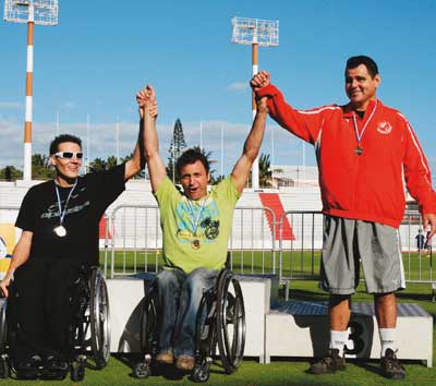 En entame de journée, Pierre Fairbank (au centre) a pris part à sa première sortie depuis les Jeux paralympiques du mois dernier. L'homme s'est imposé sur le 100 mètres fauteuil devant son compatriote Nicolas Brignone (à gauche).