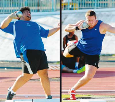 Il s'était imposé deux jours plus tôt à Koné mais, cette fois-ci, le Samoan Emmanuelle Fuamatu (à gauche), médaillé d'argent aux Jeux du Pacifique et 35e à Londres, n'a rien pu faire face au bon jet à 18,51 m de l'espoir néo-zélandais Tom Walsh (à droite)