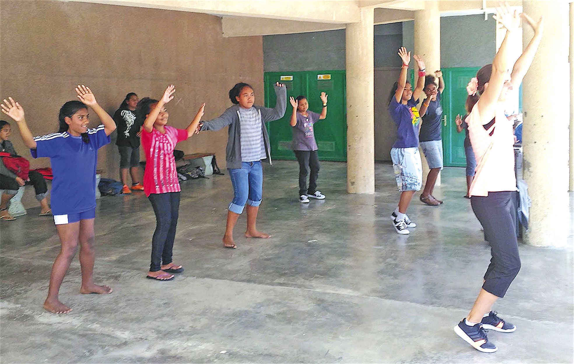 3 > Plusieurs ateliers ont été proposés aux collégiens : karaté, jeux de ballons, beach tennis, sophrologie, ou, comme ici, la danse. L’association des diabétiques de Nouvelle-Calédonie, l’Agence sanitaire et sociale et l’infirmière du collège ont également tenu des stands afin de fournir aux élèves des conseils utiles pour leur santé. Les adultes se sont prêtés au jeu en animant des ateliers et des stands, ou en participant même aux épreuves pour montrer l’exemple.