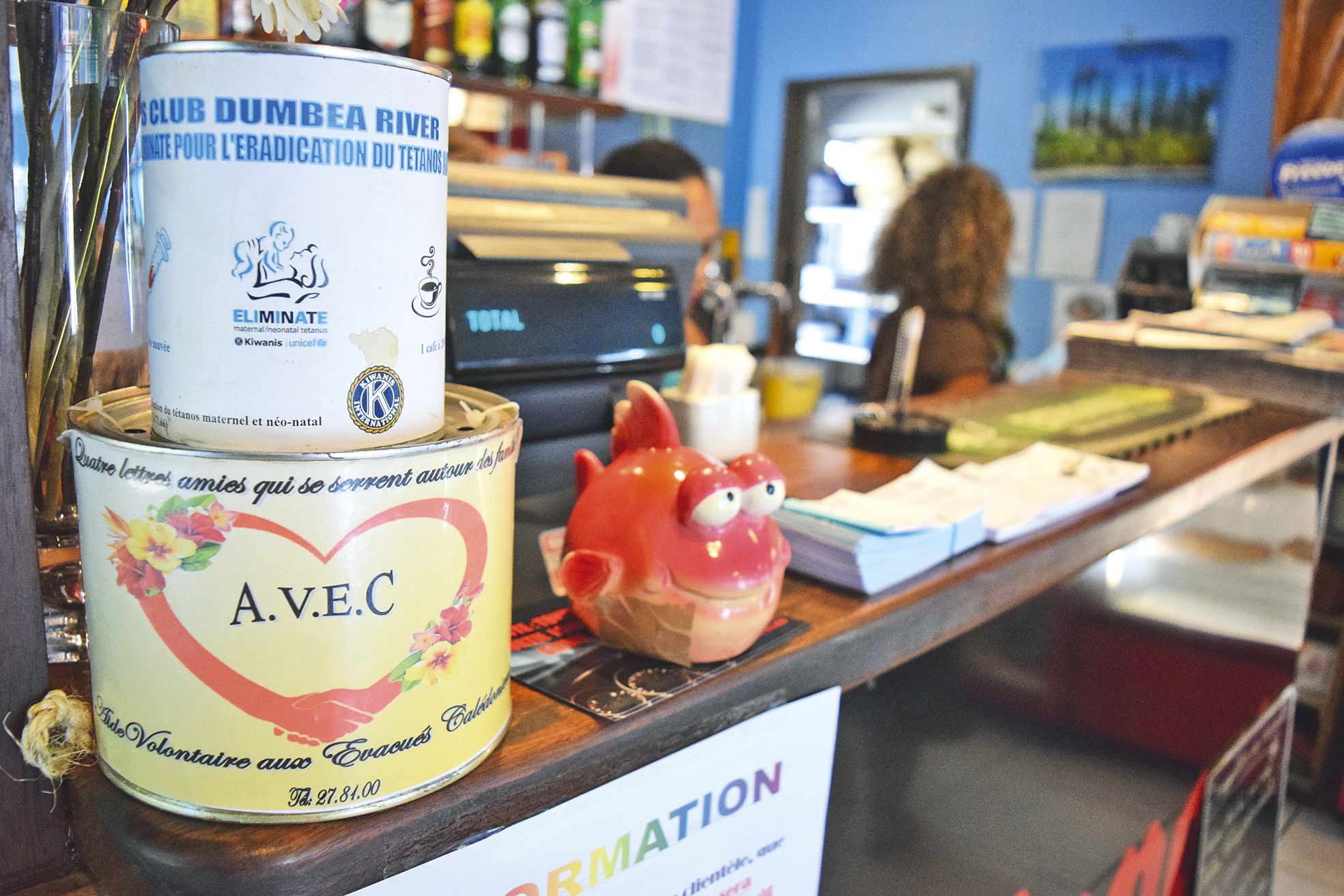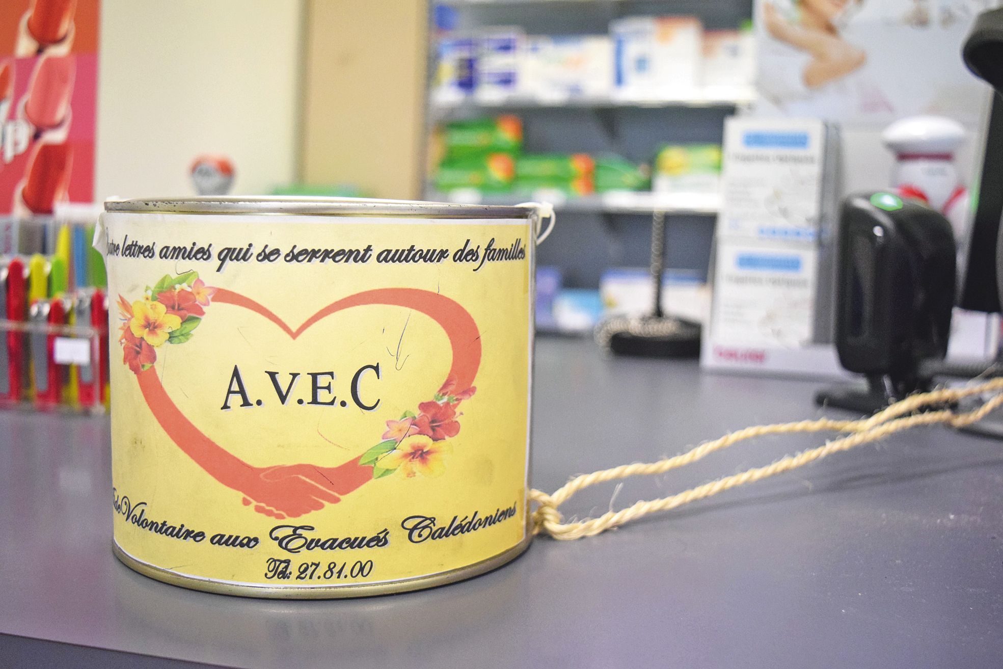 Dans ce magasin de Dumbéa, la boîte d’Avec (Association d'aide volontaire aux évacués calédoniens) a tendance à disparaître. L'équipe a donc décidé de l'attacher au comptoir.