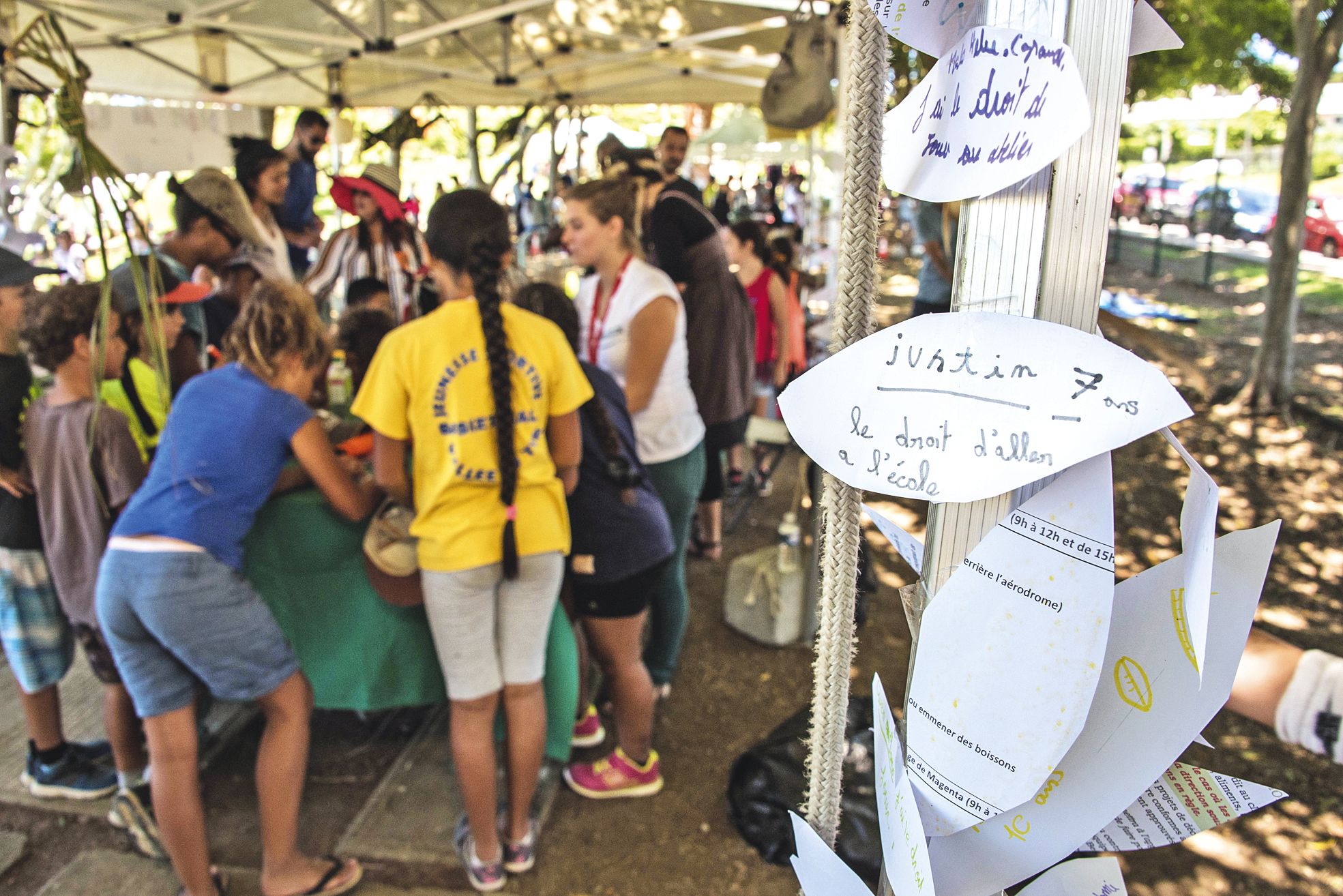 4 > La parole aux enfants ! Les participants étaient invités à déposer un petit bout de papier à leur nom, pour évoquer certains de leurs droits préférés. Cathy, 7 ans, se réjouissait ainsi d’avoir « le droit de danser et de chanter », quand Nolan, 7 ans aussi, apprécie de pouvoir « faire des gâteaux ».