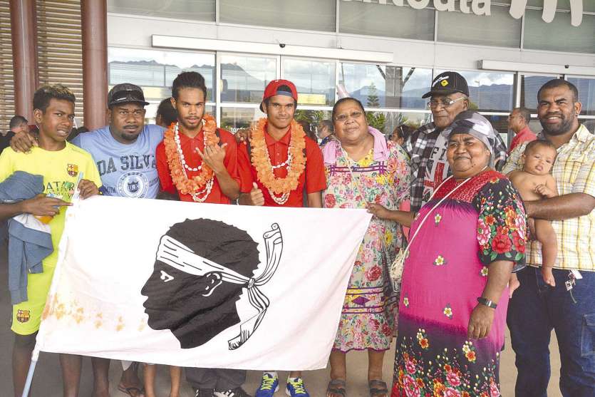 Parmi les héros de Tahiti se cachent des héritiers de grandes familles du football calédonien. Au centre, avec la casquette rouge, Paul Gope Fenepej, meilleur buteur de l’équipe, neveu de John et cousin de Georges, avec à sa gauche sa grand-mère. A sa droite, son coéquiper Vita Longue. Ce dernier est né en Corse alors que son père Benjamin (tout à fait à droite) jouait à Bastia en Ligue 1 avant de venir jouer à Magenta. Le drapeau de l’île de Beauté était donc de rigueur.