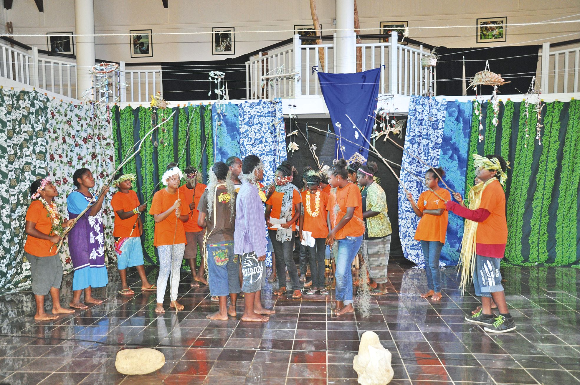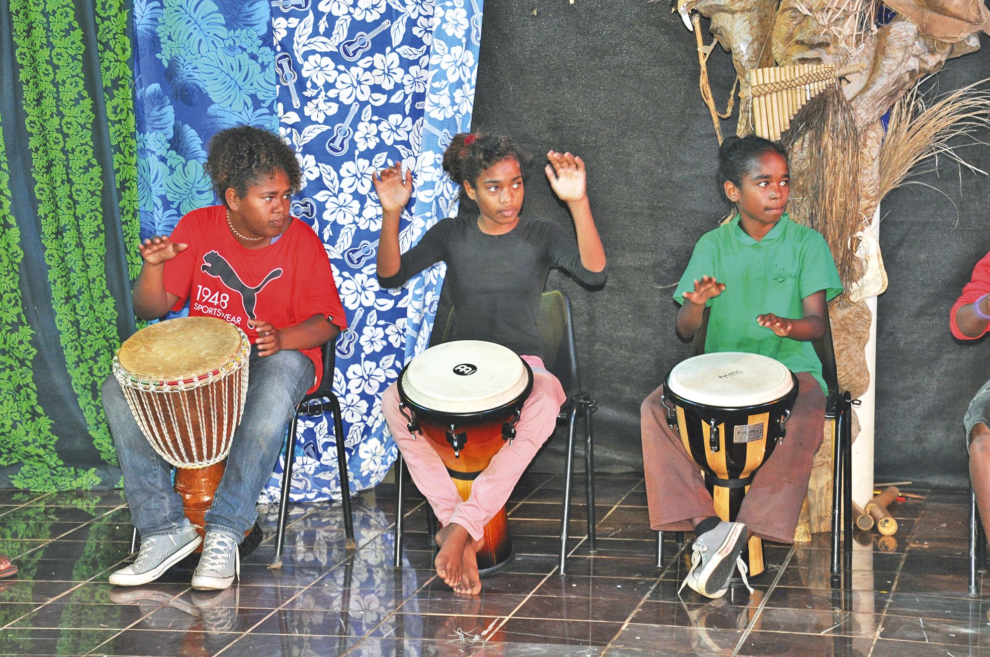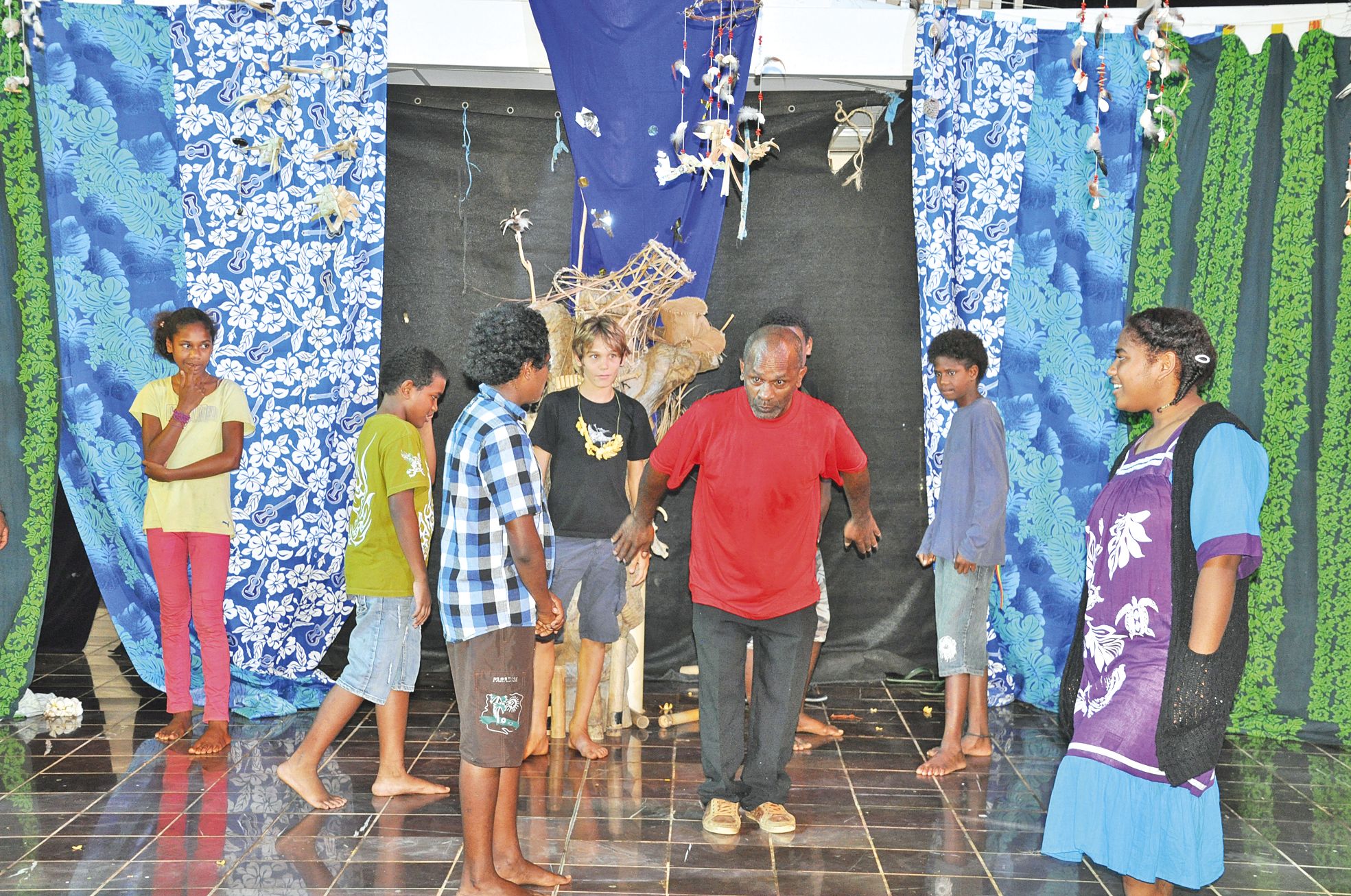 4 > et 5 > Le chef d’orchestre de l’événement, Wenic Bearune, a proposé des exercices d’improvisation pour faire découvrir l’envers du théâtre ou comment se préparer à monter sur scène sans réfléchir. Un exercice utile pour les jeunes Maréens souvent très réservés. Xavier Catherine, professeur de musique dans les deux collèges publics de l’île, a présenté le résultat des ateliers menés chaque semaine. Les élèves ont frappé les percussions sur des rythmes africains.