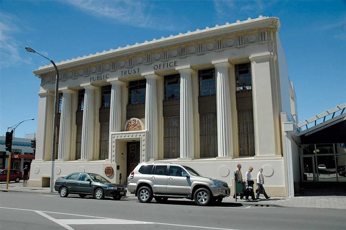 Napier, la cité de l'Art déco ; le 11/14/2011 - 16:50Le bâtiment Public Trust Office possède des colonnes de style gréco-romain.Photos : Pierre Larue et Michel Scolan