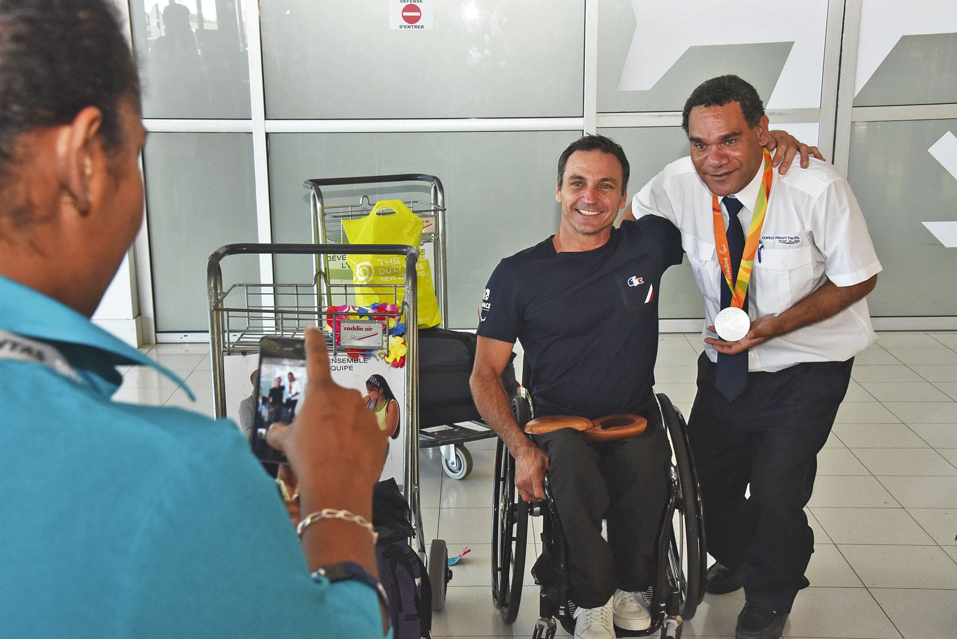 En plus des proches et des différents responsables, quelques supporters étaient présents pour féliciter les athlètes. Ici, l’un des employés de l’aéroport prend une photo avec le champion. « C’est une médaille collective. Je l’ai surtout gagné pour récompenser les personnes qui m’ont aidé. Je pense surtout à mes proches, à la famille, à mes partenaires et aussi aux Calédoniens », a expliqué Pierre Fairbank.