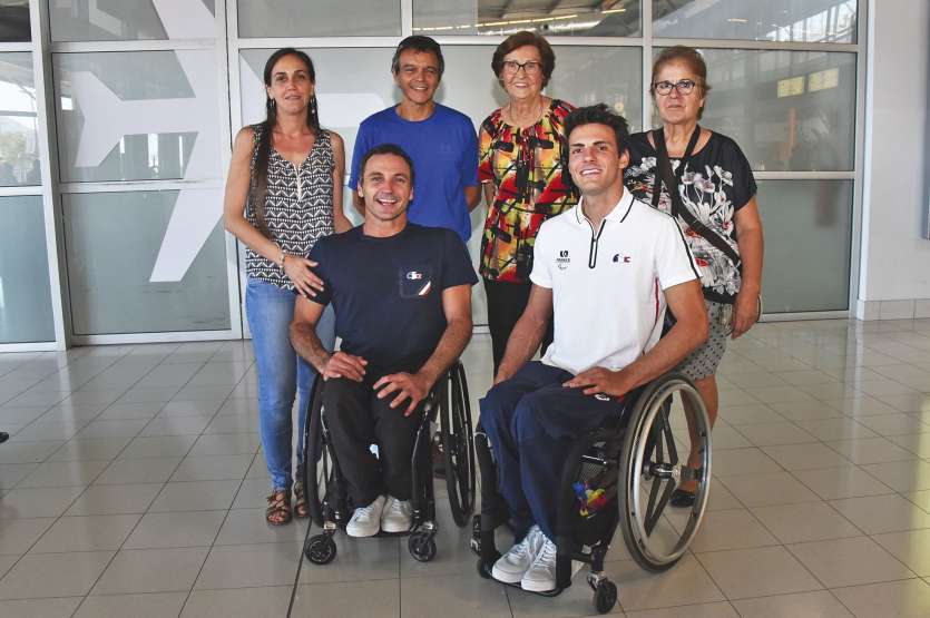 Les athlètes paralympiques calédoniens, revenus de Rio hier midi, étaient attendus à l’aéroport. Sur la photo, Pierre Fairbank et Nicolas Brignone entourés (en partant de la gauche) de la compagne de Fairbank, de Jose Marquez, président du Handi club calédonien, de la mère de Fairbank ainsi que de Maria Innaurato, responsable de l’Association calédonienne de sport adapté.