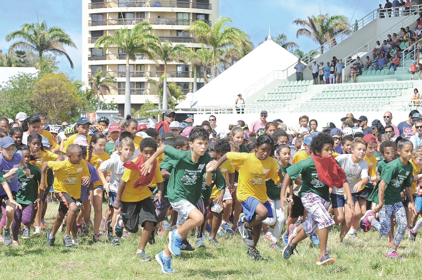 C’est parti ! 740 jeunes de primaire, collège et lycée - mais aussi, pour la première fois quelques enfants de maternelle - s’étaient réunis samedi matin pour un duathlon course à pied - vélo. L’événement était comme chaque année organisé par l’Office central de la coopération à l'école (OCCE) en partenariat avec la ligue calédonienne de triathlon.