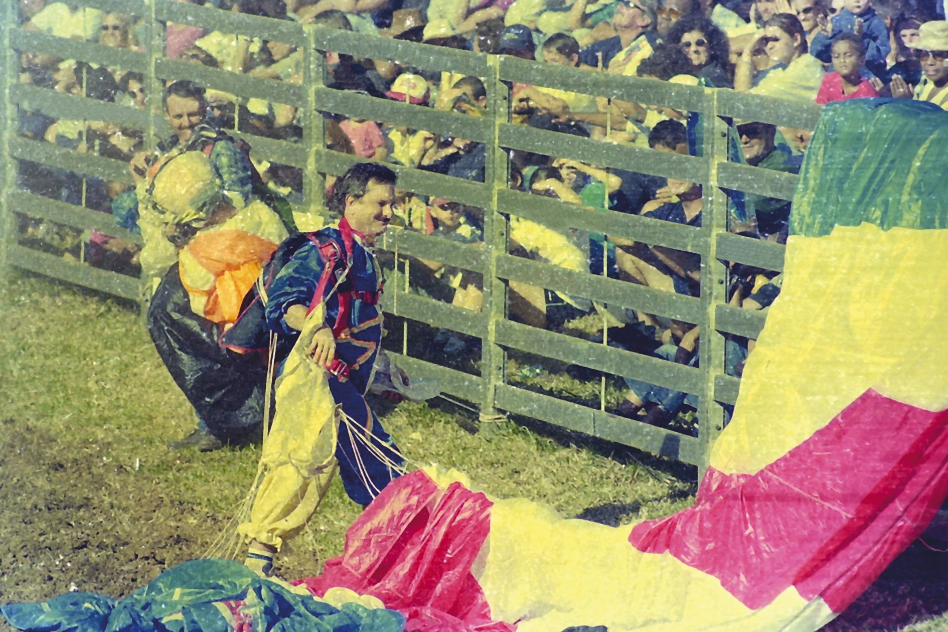La Foire et les parachutistes, c’est une longue histoire d’amour. Ces fous volants atterrissaient au moment de l’inauguration sur une cible au milieu de l’hippodrome, apportant le drapeau de la Foire depuis le ciel.