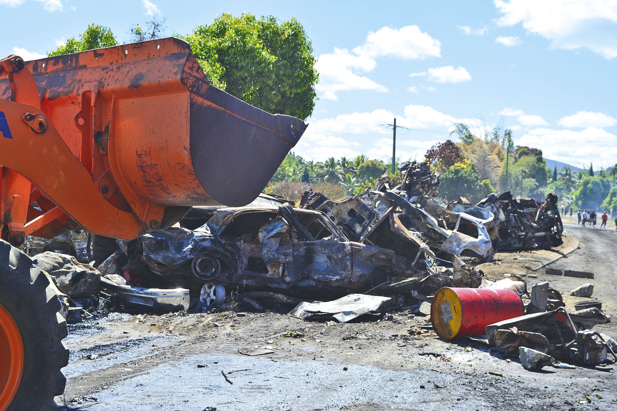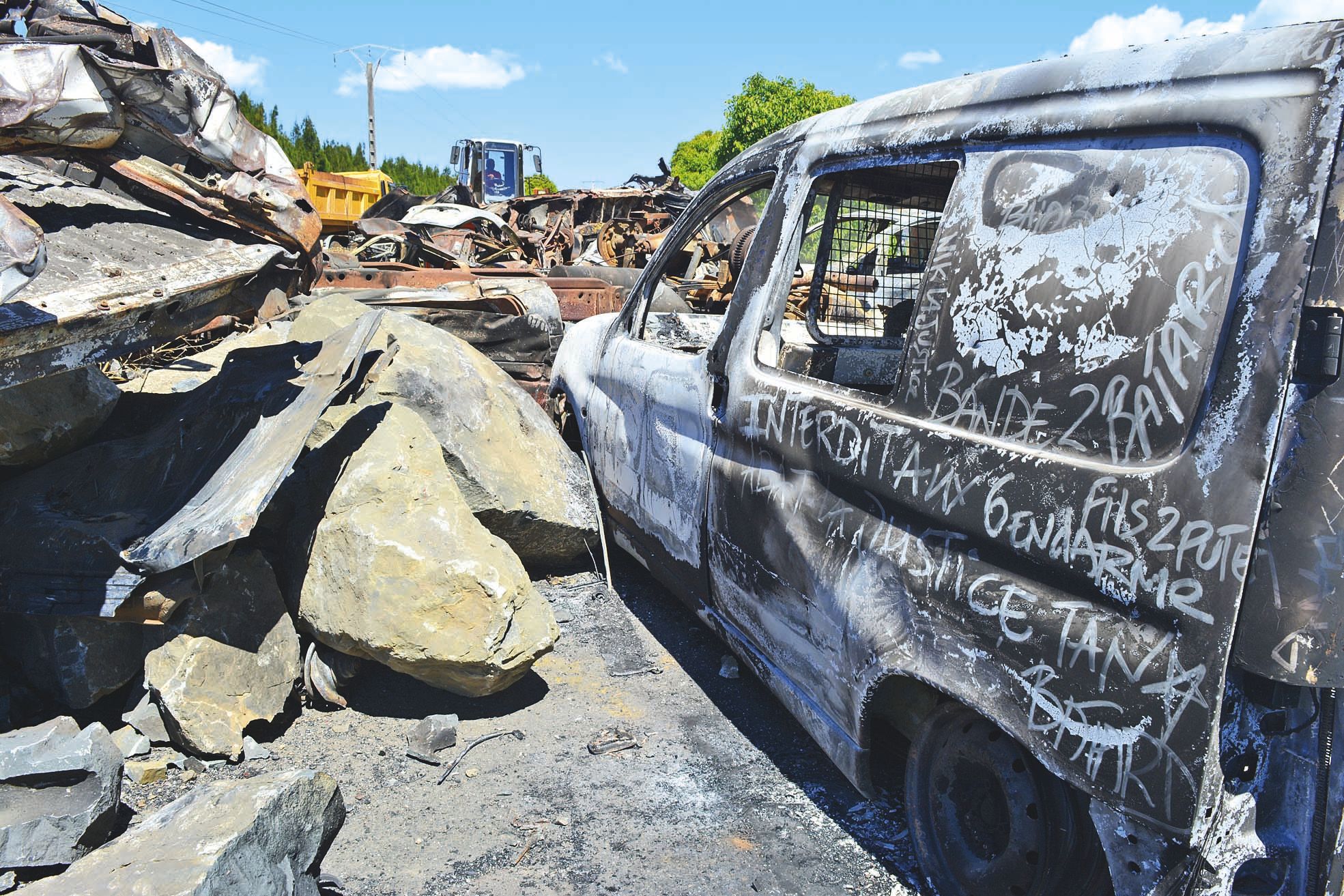 2 > Le déblayage des montagnes de carcasses a pu démarrer dès six heures, au niveau du premier barrage sud, vers La Coulée. Pour la partie nord, à l’entrée de la mission de Saint-Louis, une négociation a été menée au préalable entre le maire Éric Gay, les coutumiers et les jeunes de la tribu. Interrompus la veille, les travaux ont pu reprendre vers 9 h 30. Sans encombre.