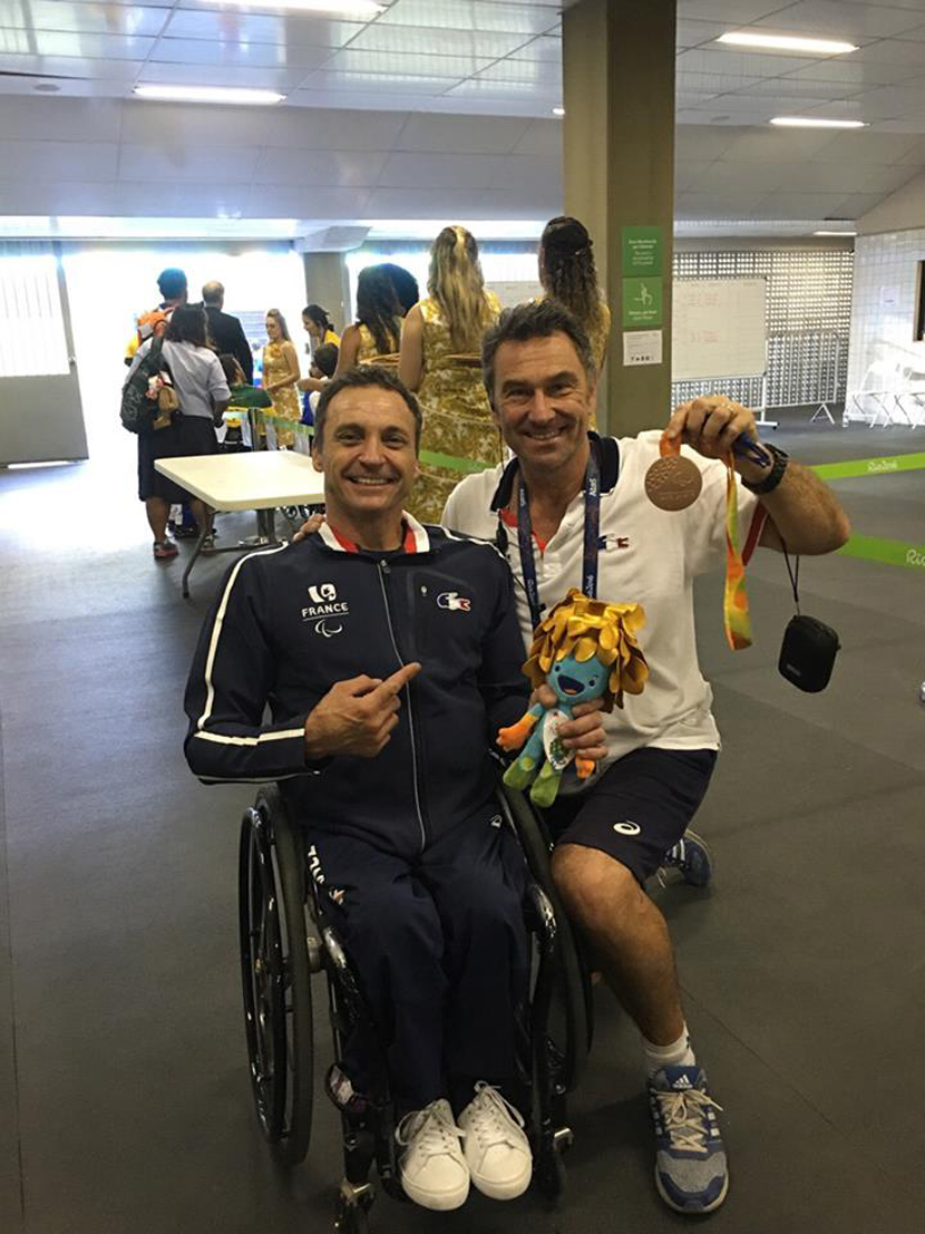 Pierre Fairbank pose avec Olivier Deniaud, entraîneur des équipes de France handisport d’athlétisme. (photo Facebook Pierre Fairbank)
