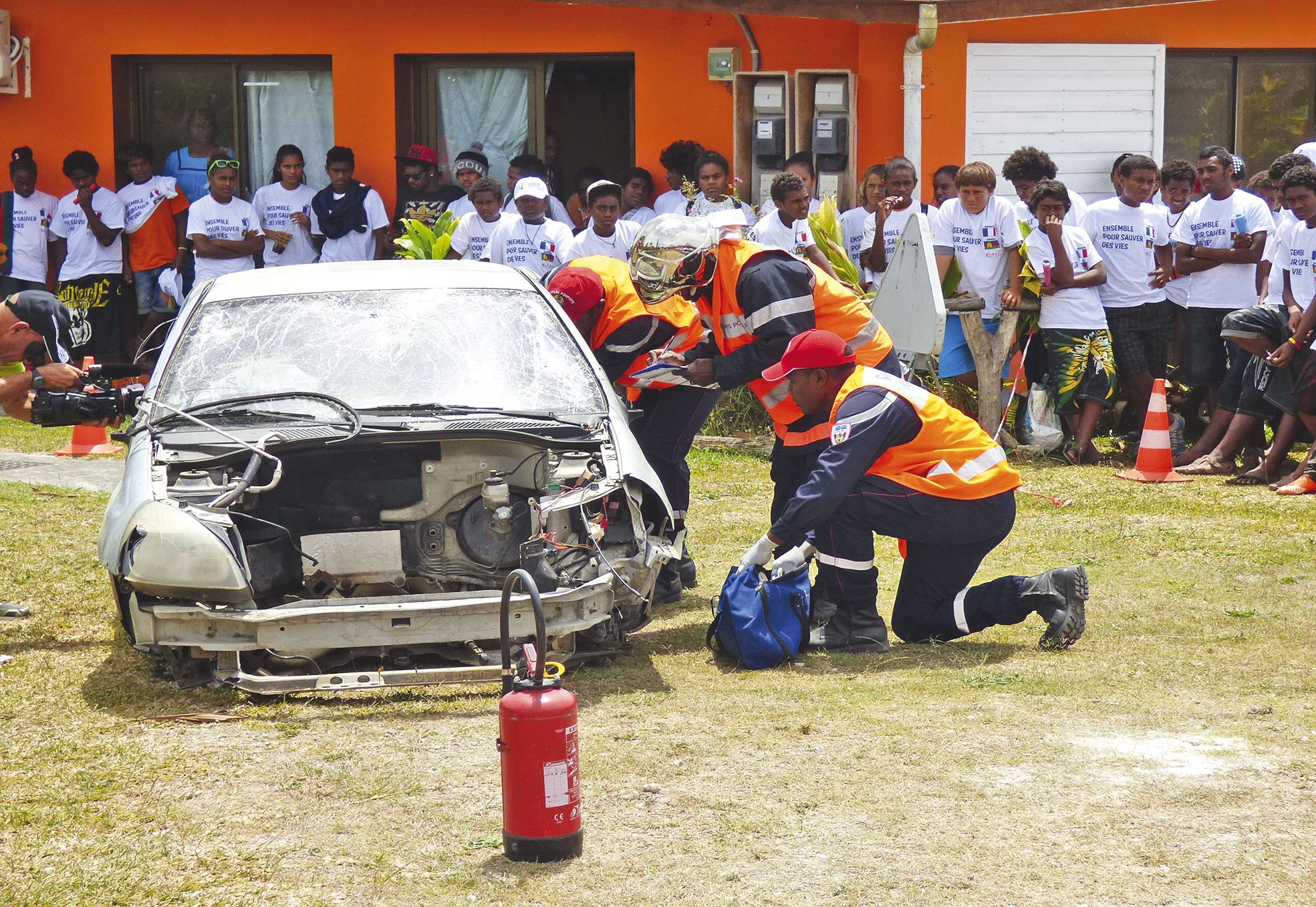 Les collégiens ont assisté, sur le parking de la mairie, à une démonstration de secours routier avec désincarcération d’une victime (rôle joué par une collégienne) par les sapeurs-pompiers du centre d’incendie et de secours (CIS) de Lifou.