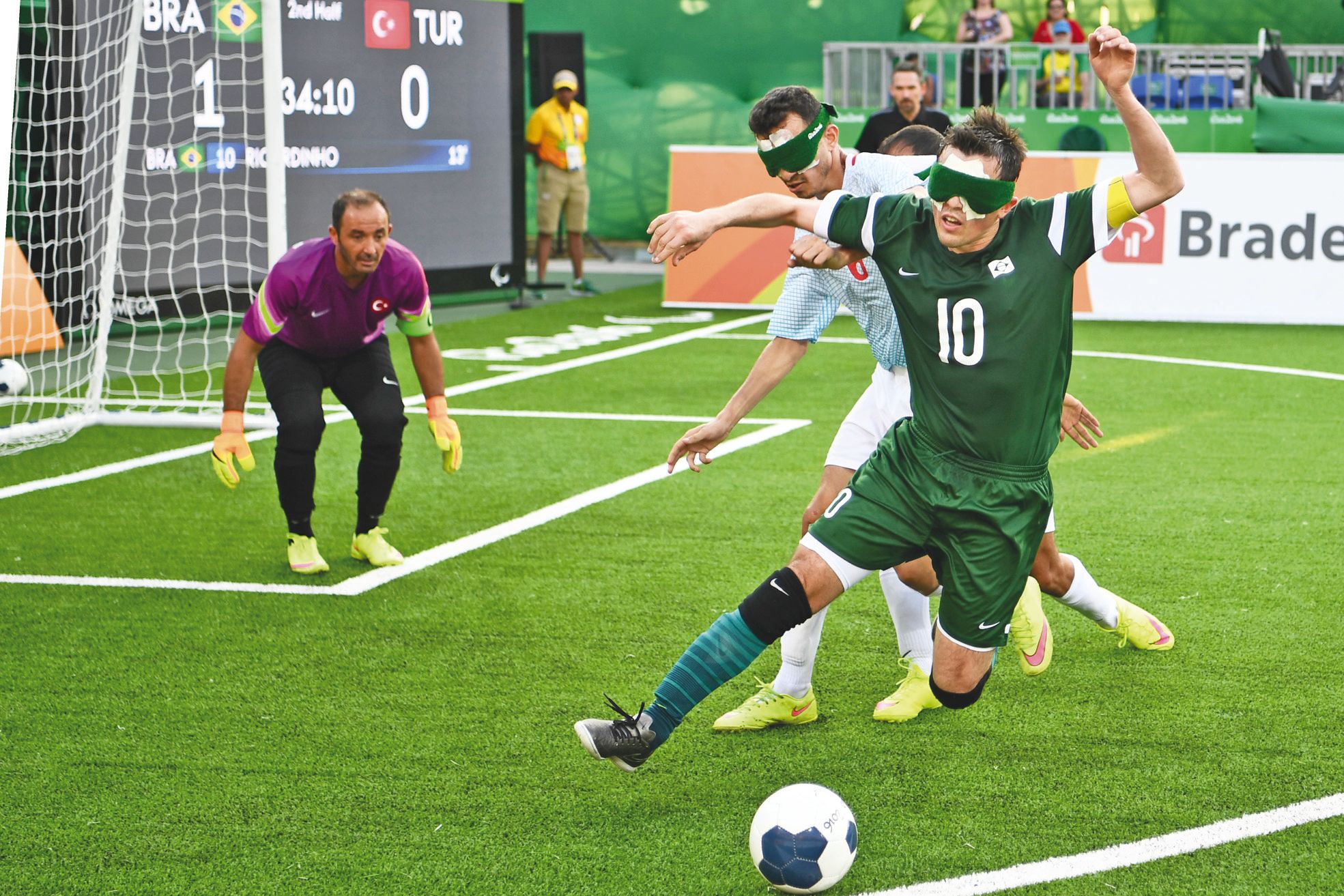 4 > Football. Vainqueurs 3-1 des Marocains au premier match, les Brésiliens (maillot vert) ont battu les Turcs, hier, 2-0. Déjà buteur contre le Maroc, Ricardinho (premier plan) a récidivé. Le Brésil est en tête du groupe A dans le tournoi de cécifoot (à 5 contre 5).