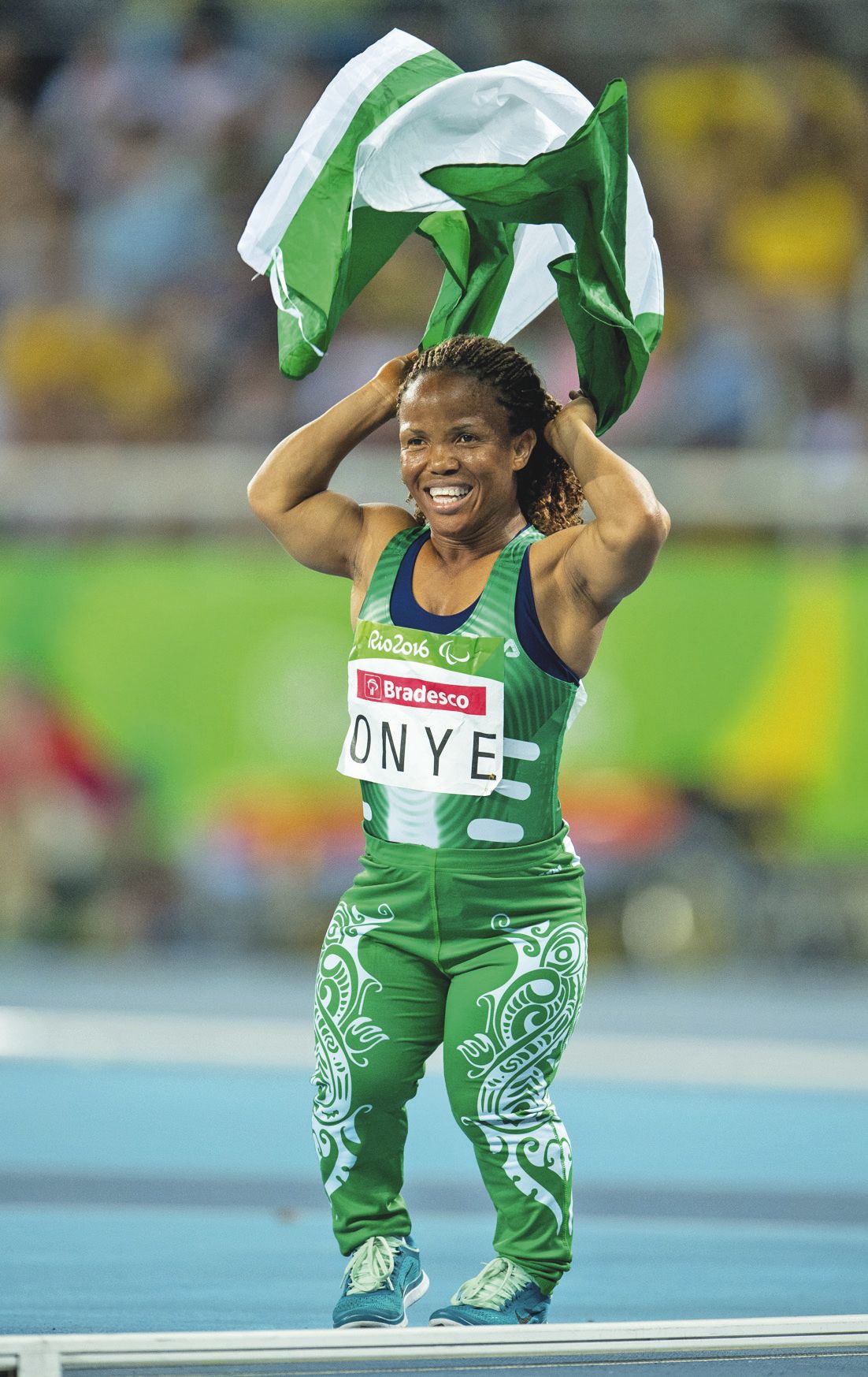 5 > Athlétisme. La Nigériane Lauritta Onye, heureuse après son titre et son record du monde au lancer de poids (8,40 m) en F40.
