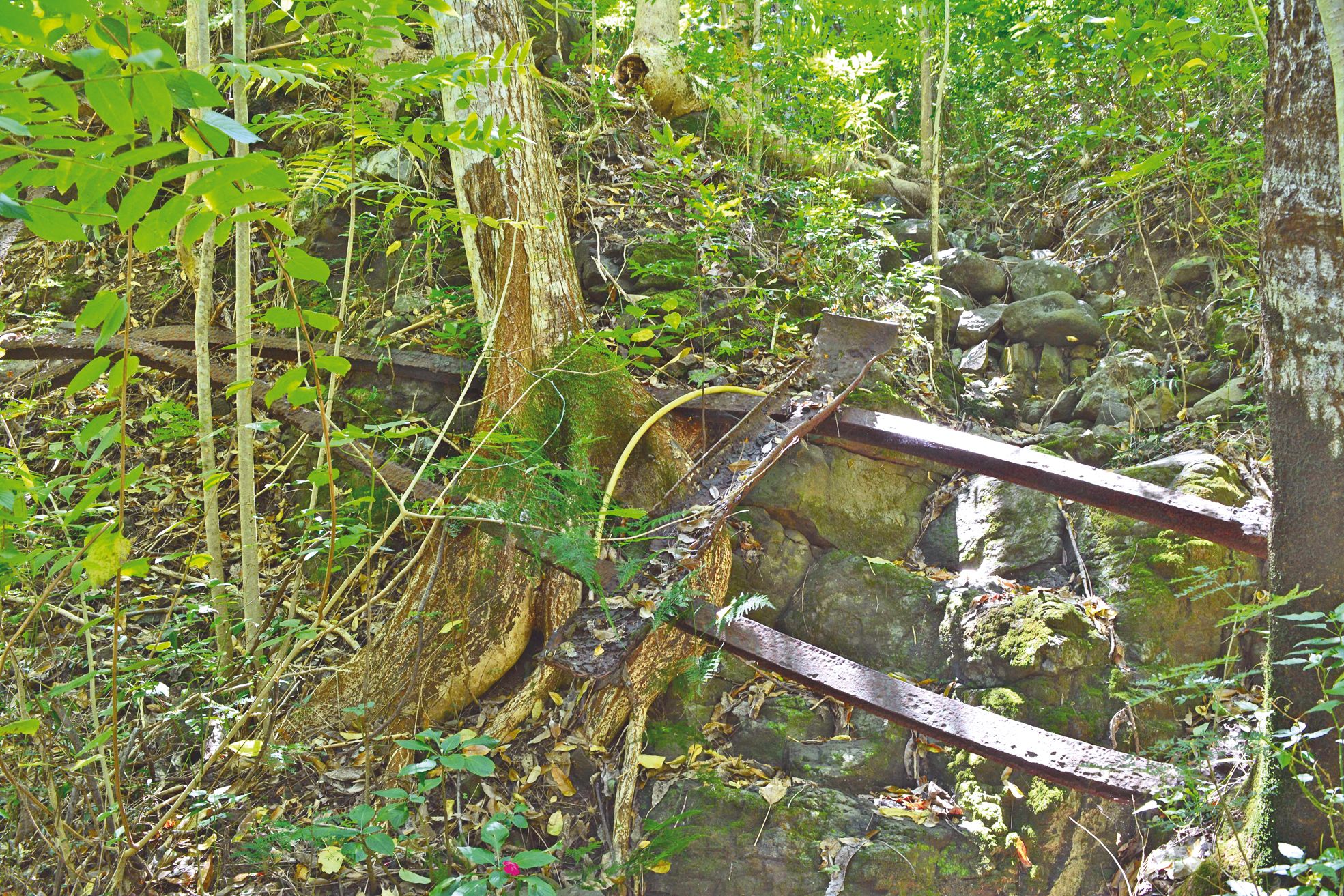A l’entrée de Dumbéa, le train serpentait sur les hauteurs du col de Tonghoué pour regagner la plaine de Koé. Aujourd’hui encore, le long d’un sentier en pleine forêt, le promeneur peut remarquer quelques portions de rail rouillées.