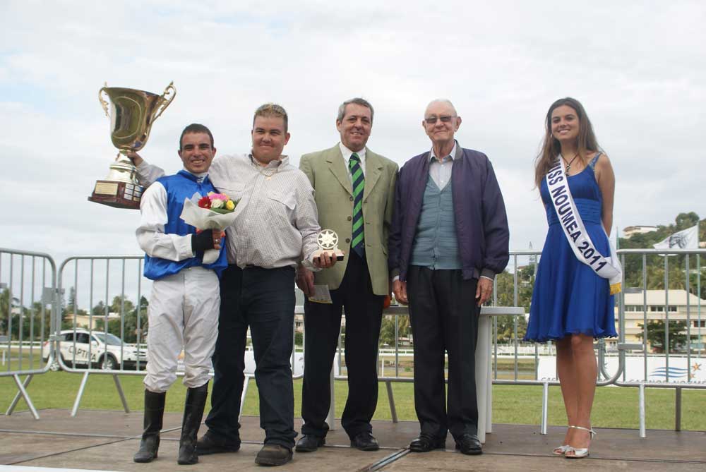 hippis ; le 07/10/2011 - 20:00L'entraîneur de Strawberry Tart, Katia Moglia, tient fièrement la Coupe de la victoire de Strawberry Tart dans la Nouméa Cup.