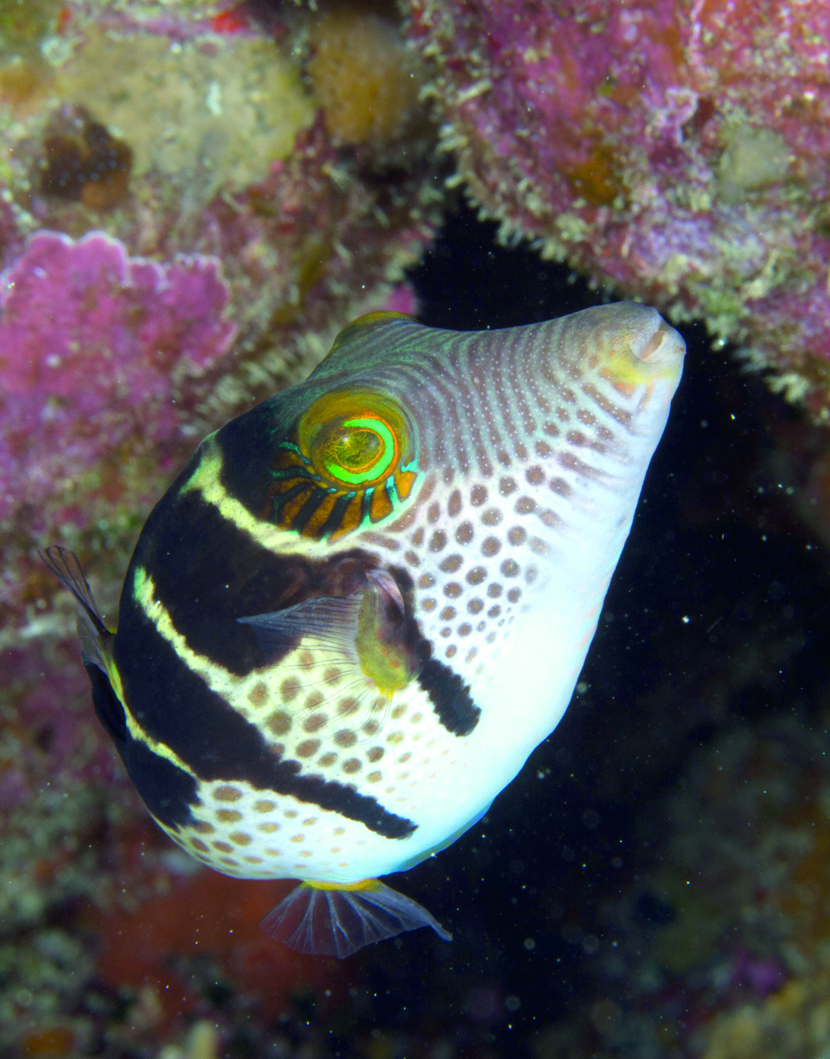 1 > Un canthigaster valentini, dit « canthigaster à selle », visiblement intrigué par l’appareil de Sylvain Charrière. Les photographes observent souvent patiemment les animaux marins avant de pouvoir capturer leur expression.