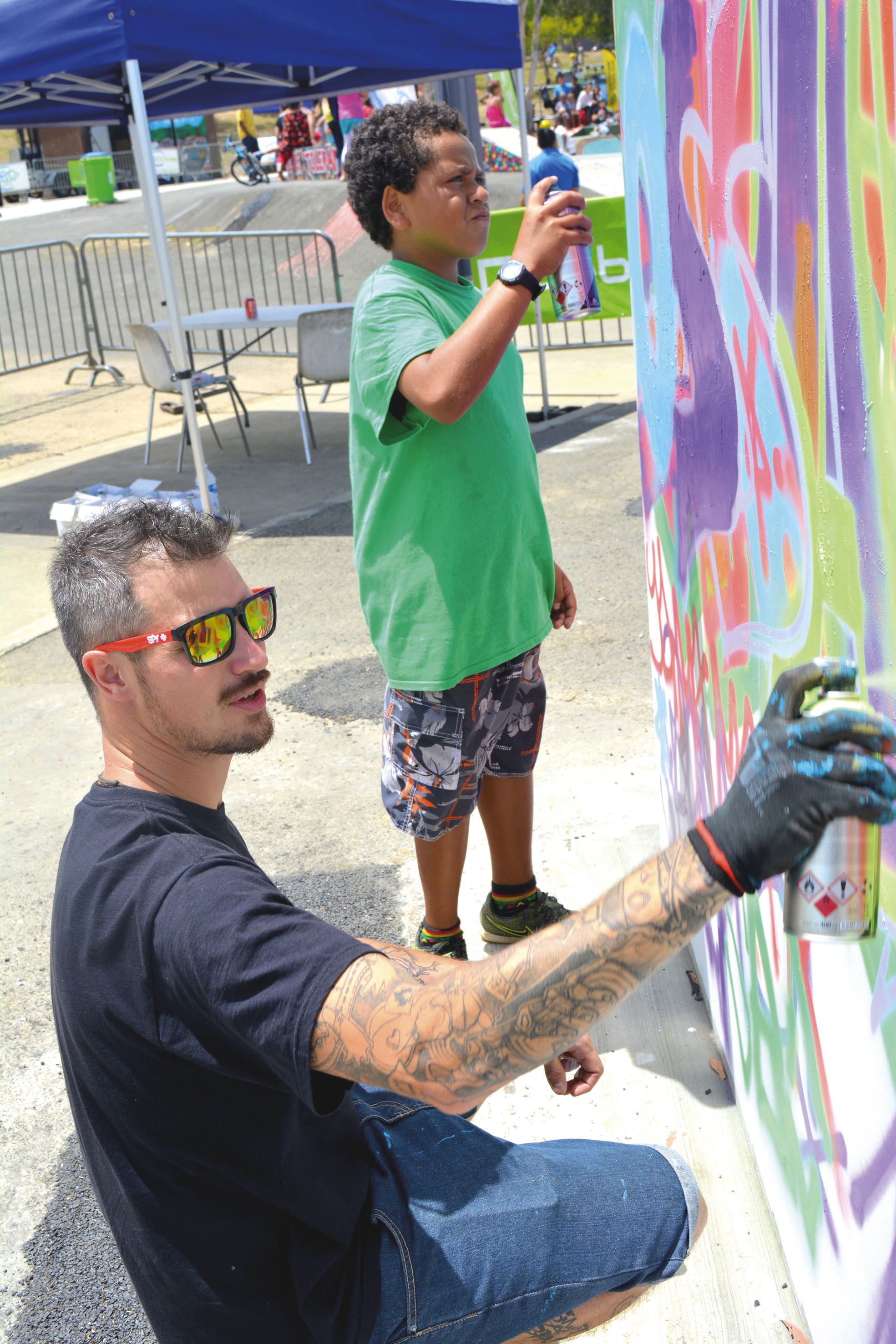 Une journée axée sur les cultures urbaines n’aurait pas été complète sans un atelier de graff… Et des artistes aux petits soins pour initier les jeunes.