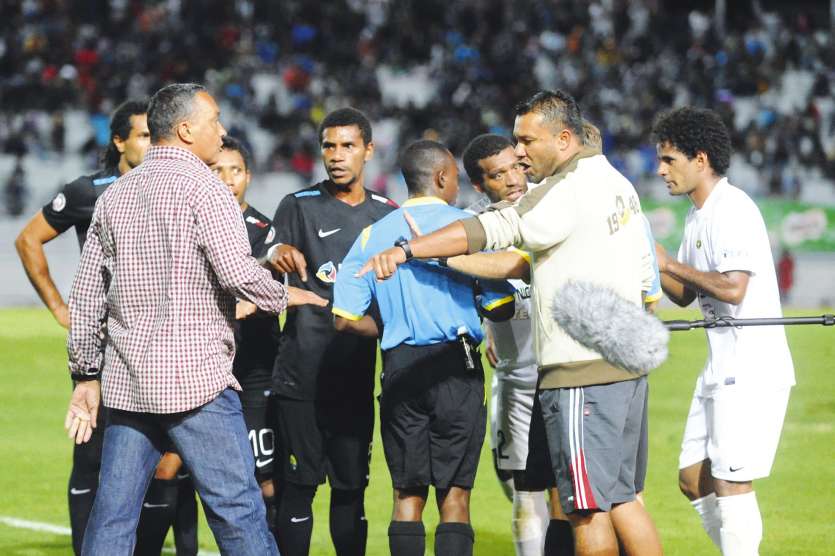 Hélas, ce n’est pas une image de jeu que l’on retiendra de cette finale de Coupe de Calédonie mais bien les conditions du deuxième but de Magenta et ses conséquences. Ici l’arbitre Brahima Mahamoud pris à partie entre les intérêts de Magenta et ceux de Hienghène.