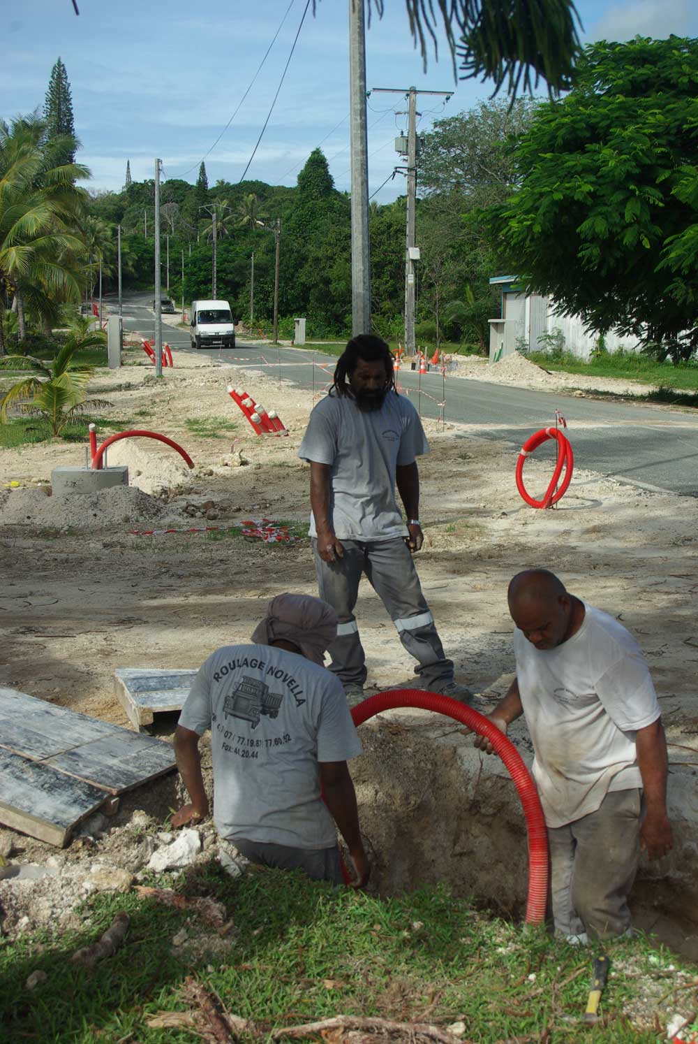 Les ouvriers enterrent les fils électriques sous la route du centre du village.