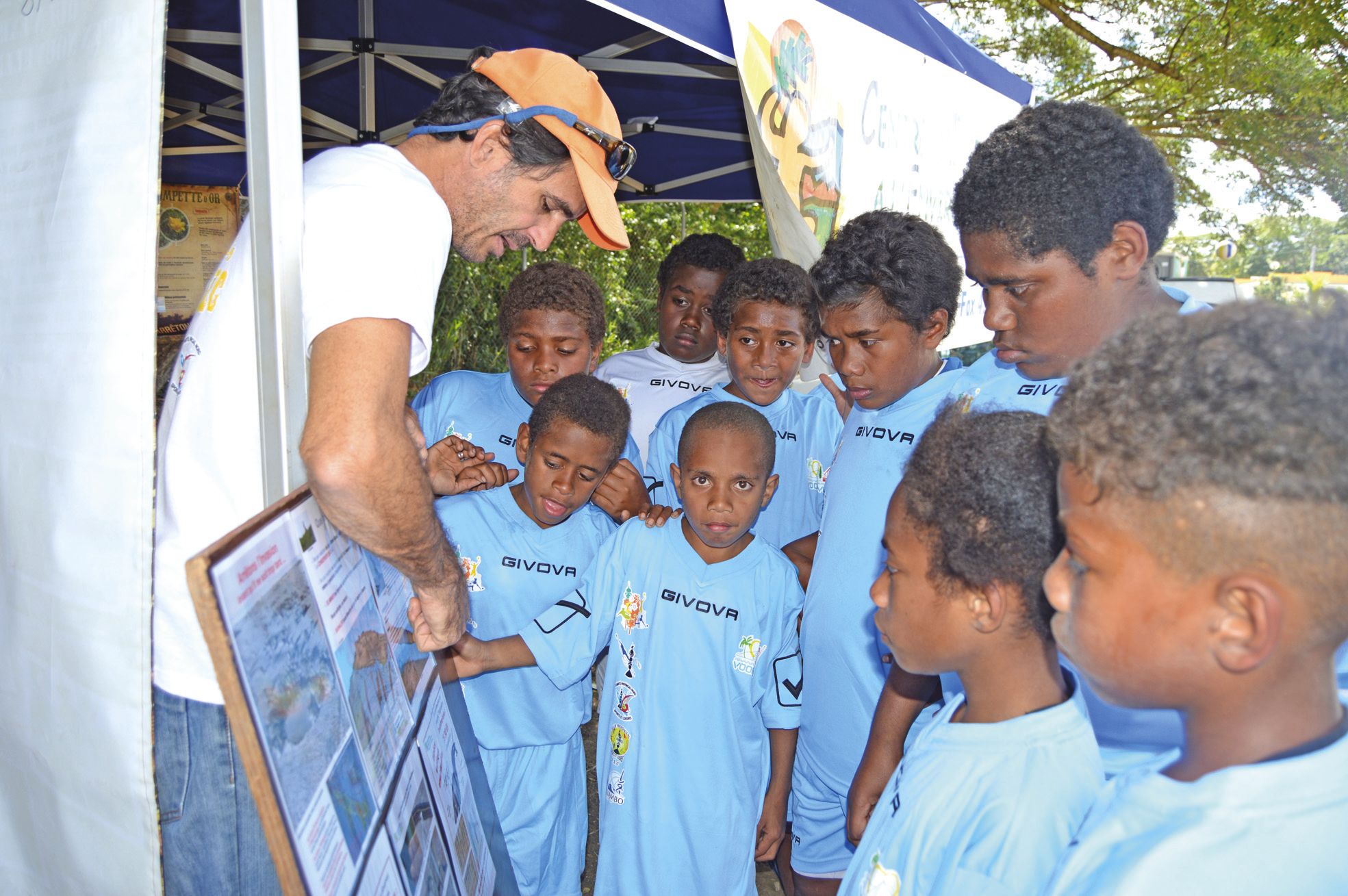 Pour que les jeunes trouvent le temps moins long entre chaque match, le Comité provincial Nord sports et loisirs a invité plusieurs intervenants : le Centre de recrutement, concours et sélection de la gendarmerie de Nouméa, les gendarmes à cheval du Psig, Gilles Estève, intervenant de rugby au club de Népoui. Julien Barrault, animateur à l’antenne Nord du Centre d’initiation à l’environnement, a tenu un stand sur les espèces envahissantes (sur la photo). Enfin, les enfants ont pu pédaler sur une piste de sécurité routière.