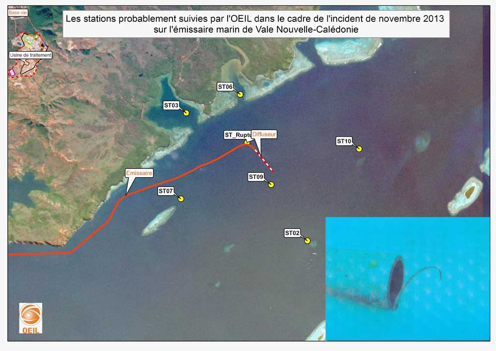 La rupture du tuyau (en médaillon) est située à l'entrée du diffuseur de Vale NC en baie de Prony.
