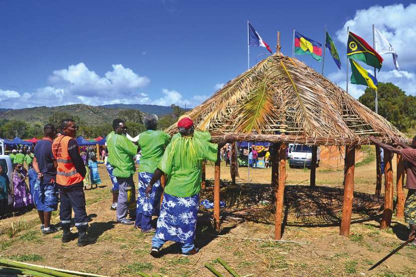 Conduits par Alphonse Poinine, le maire de Touho, et accompagnés par des danseuses de Tiouaé, les invités se sont dirigés vers la grande case où ils ont été symboliquement reçus par des discours et des gestes coutumiers. « Une journée comme celle-là, c’est une manière de se retrouver dans une même commune », a déclaré Alphonse Poinine. « C’est un moment d’échange et de partage avec les autres comme le montre cette case : les gens d’Iaai font la charpente et la toiture, les gens du Vanuatu font le contour. »