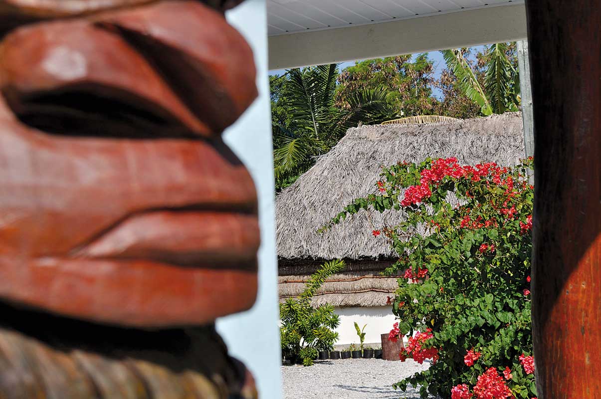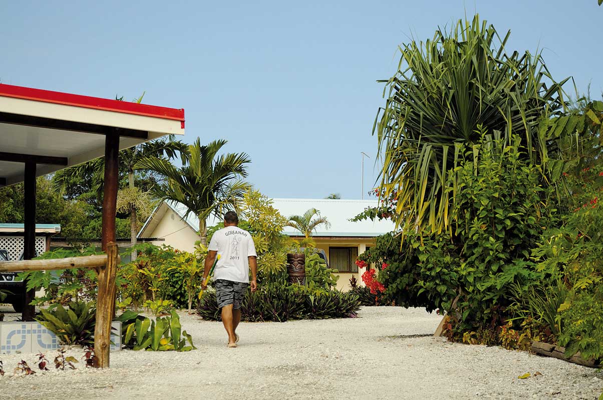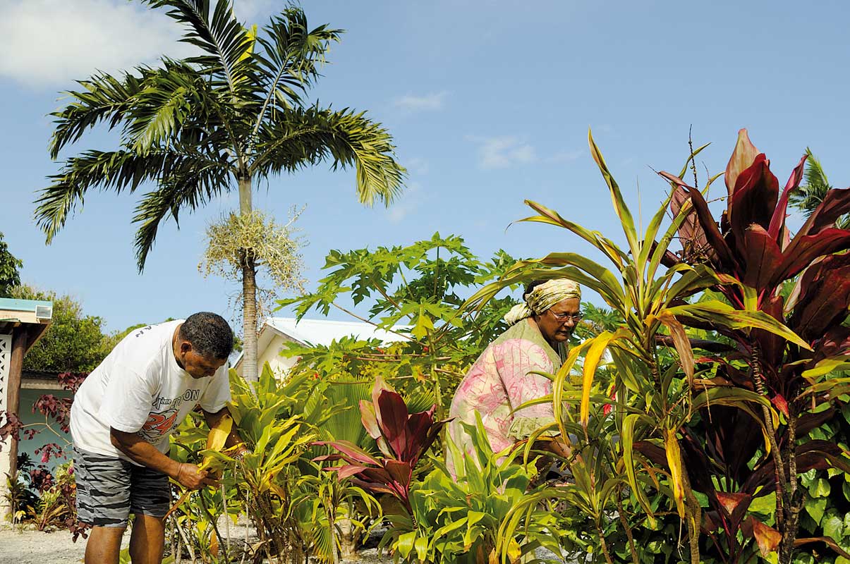 Un jardin d'Eden ; le 07/21/2011 - 16:11Roland et Rosaire ont crée un jardin luxuriant autour des cases. Cet espace vert contraste avec les couleurs du lagon et les plages de sable blanc qui font la réputation de l'atoll.Photo : Eric Biesse