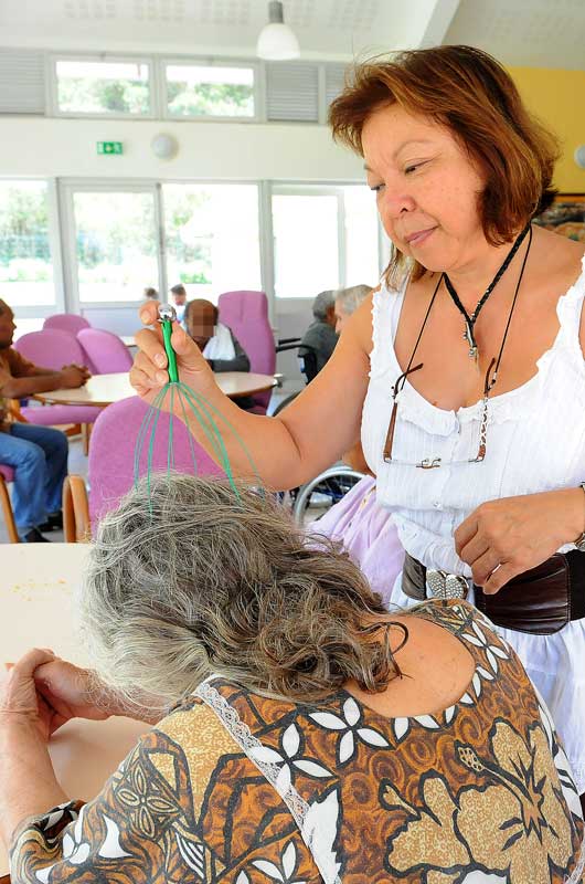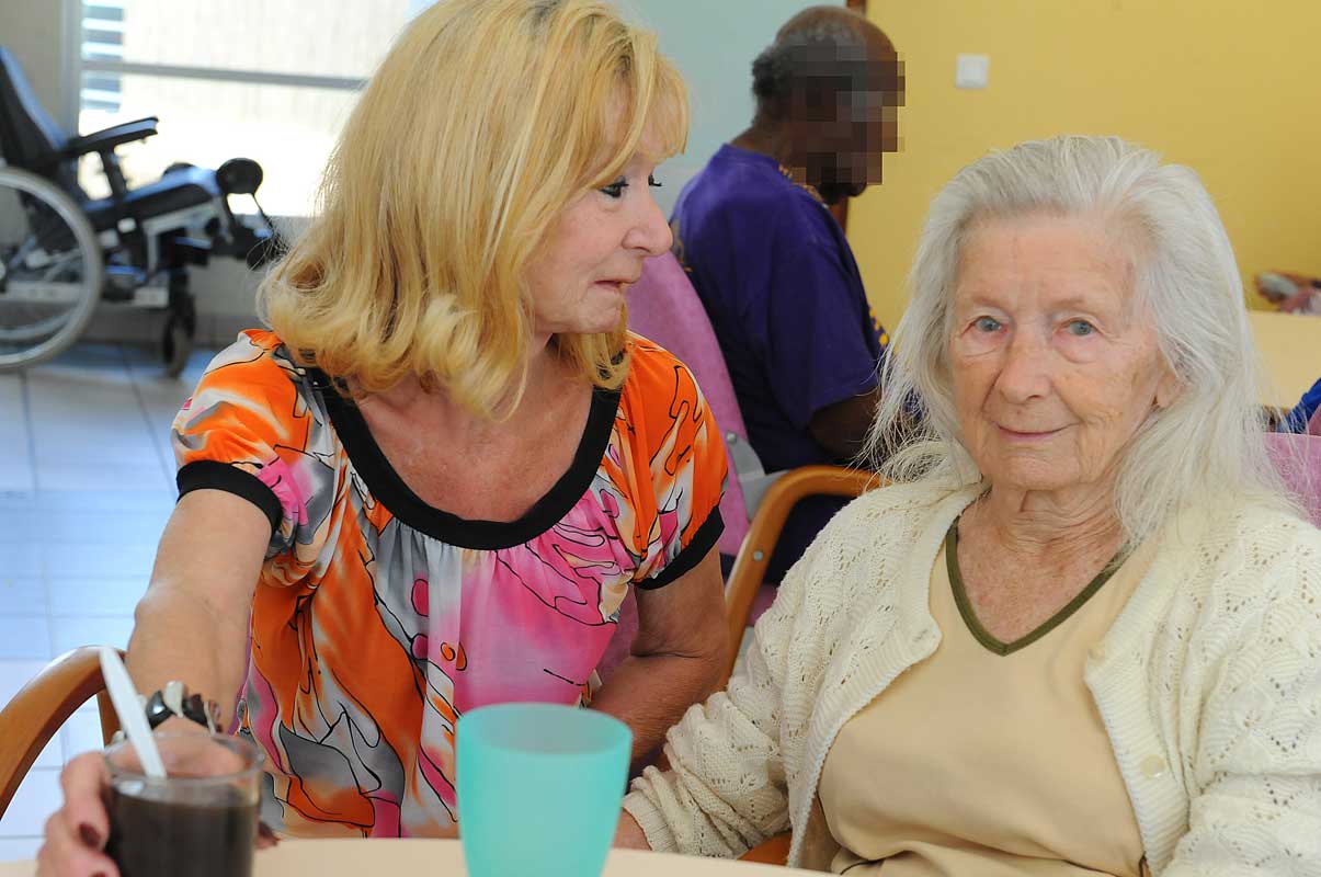 Un séjour pour mémoire ; le 09/28/2011 - 18:07Entre repas et visite des familles, le personnel tente de satisfaire au mieux les désirs des patients. Peu à peu les liens se tissent, comme avec le galant Joachim, adepte du baise-main.Photo : Jacquotte Samperez