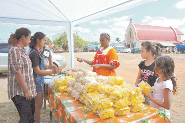 Puy, Yaya et Léonce proposaient à la vente les fruits de leur travail : mwata coco et caramel, mwata bananes, desserts à la citrouille et aux lamelles de noix de coco, chips poingo pimentées, couennes soufflées, mais également des sculptures (flèches faîtières). Chaque exposant a donné, à son gré, un certain pourcentage de sa recette au Comité paroissial qui réinvestira les fonds dans la continuation de la rénovation du presbytère.