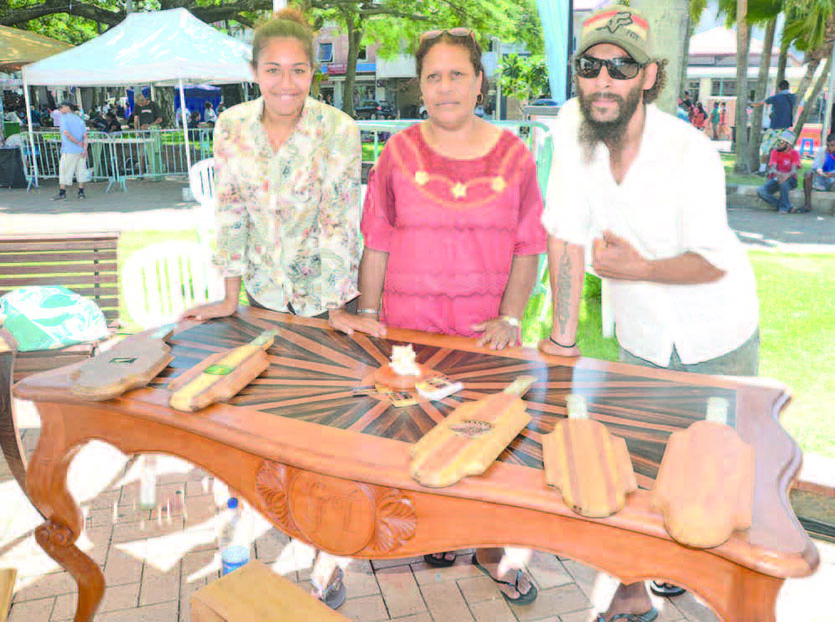 À droite, l’ébéniste et sculpteur Yolrick Tyuienon a fait le déplacement de la tribu de Kuiné, à Canala, afin de montrer ses réalisations en houp, en bois noir, en merisier d’Amérique, en kohu, en palissandre, ou encore en ébène.