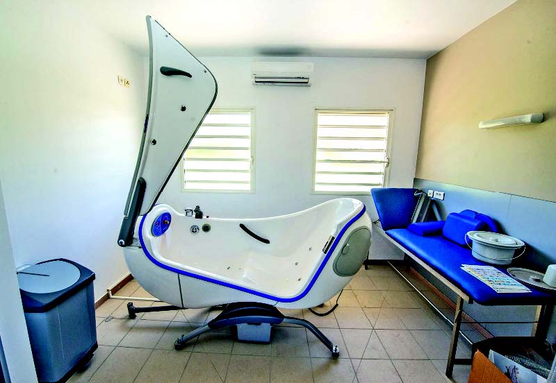 Une salle de bains avec une baignoire de balnéothérapie est à disposition. Elle peut se mettre à l’horizontale ou à la verticale, et elle se nettoie toute seule.