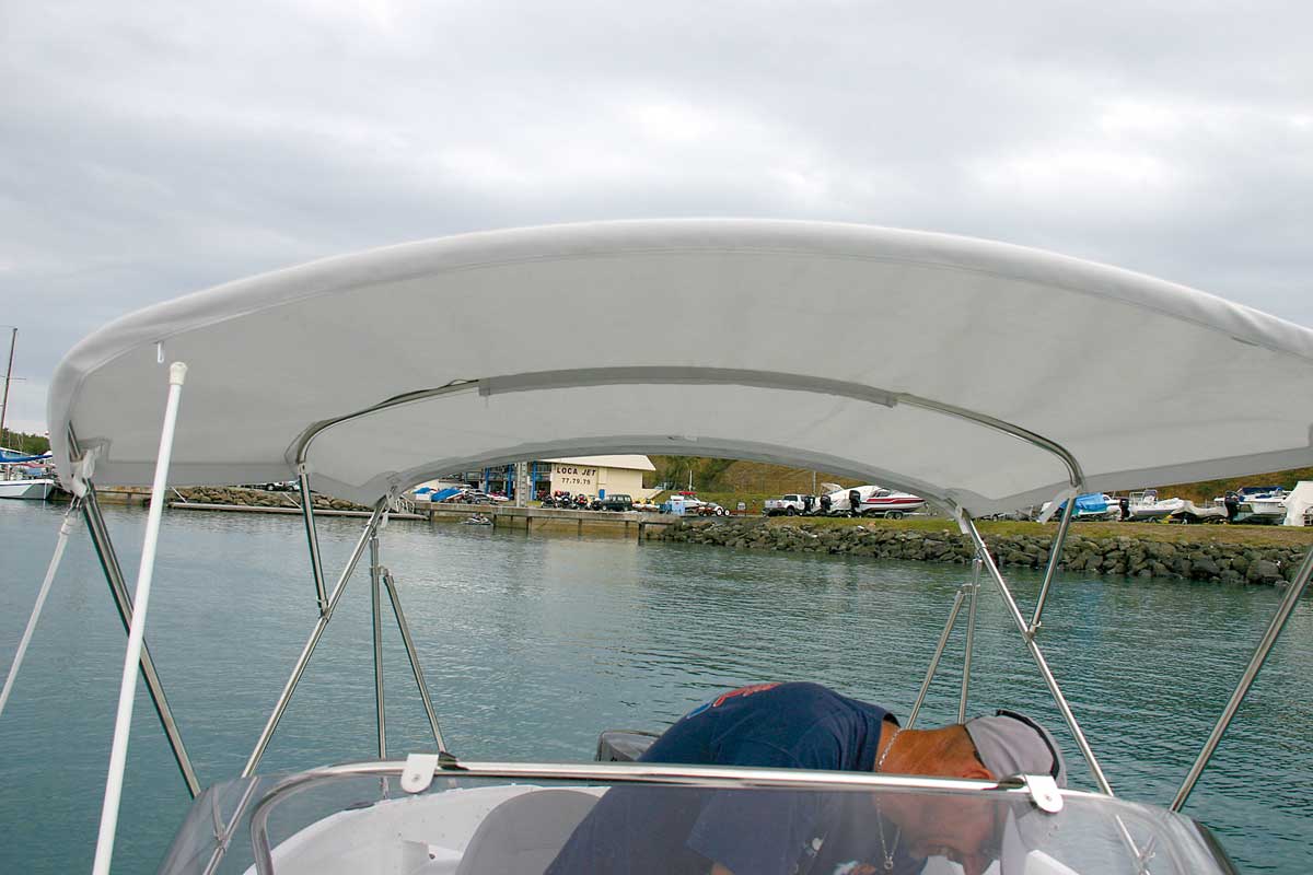 Le bimini en option est indispensable sur ce type de coque pour supporter le rayonnement solaire, notamment au mouillage. Il protège une grande partie du cockpit.
