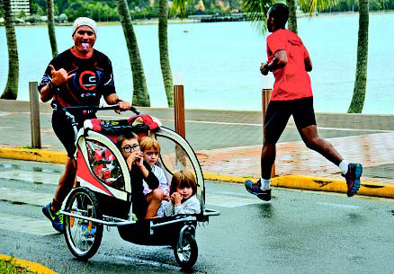 Il faut savoir parfois faire preuve d’un esprit familial. Ce père ne courait pas les 42 km du marathon de Nouméa dimanche, mais le 10 km qui était organisé en parallèle. L’occasion d’une belle sortie dominicale avec les enfants. Photo MRB